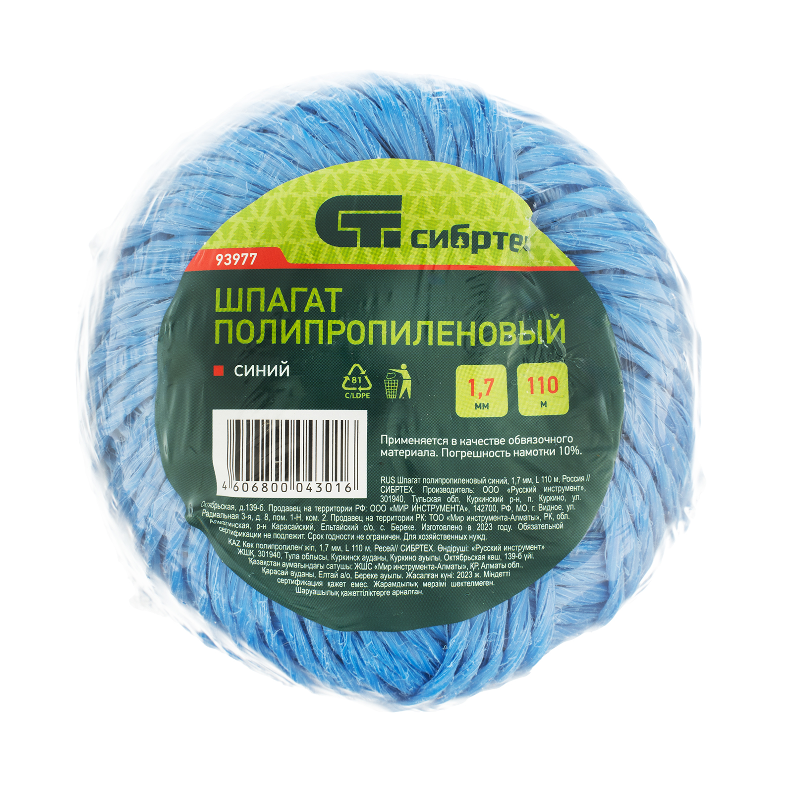 Шпагат полипропиленовый синий, 1.7 мм, L 110 м, Сибртех в Воронеже