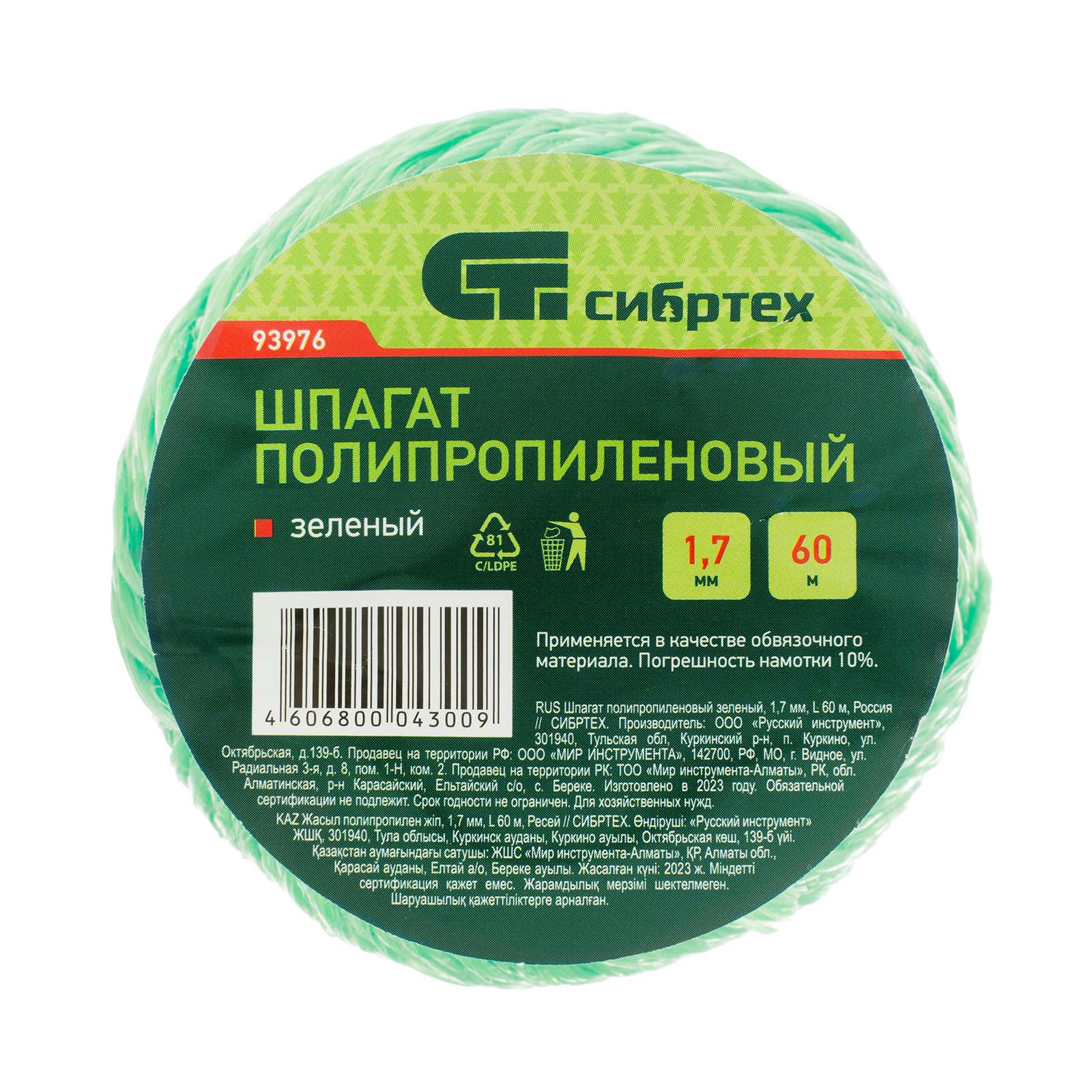 Шпагат полипропиленовый зеленый, 1.7 мм, L 60 м, Сибртех в Воронеже