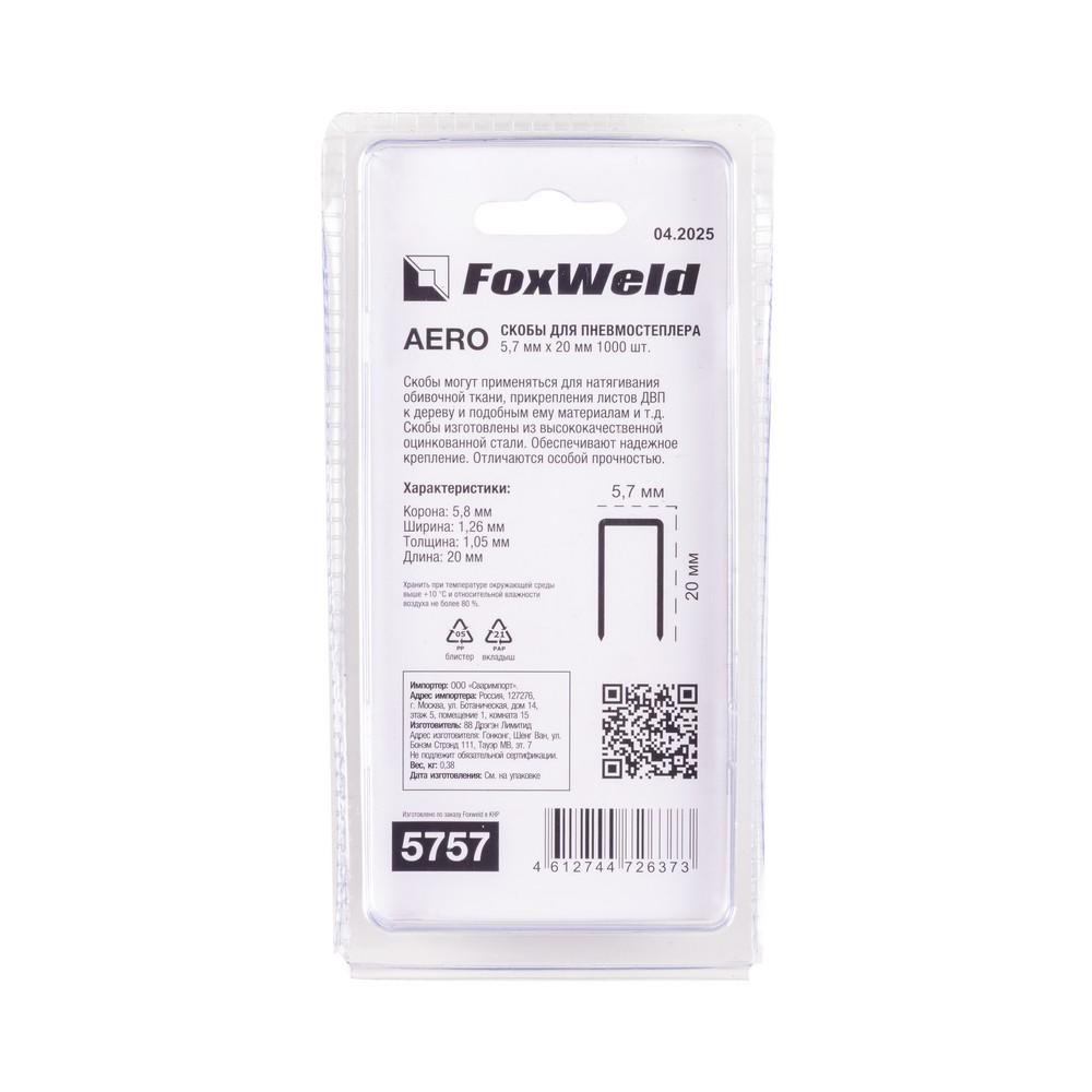 Скобы для пневмостеплера AERO типа 18GA 9020 5,7 мм х 20 мм - 1000 шт. Используются для надежного закрепления обивочной ткани, прикрепления листов ДВП к дереву. Скобы изготовлены из высококачественной оцинкованной стали и отличаются высокой прочностью. Используются в различных областях производства, строительства, а также в быту. Данные скобы подходят для пневмостеплеров всех производителей, работающих с данным типом скоб.