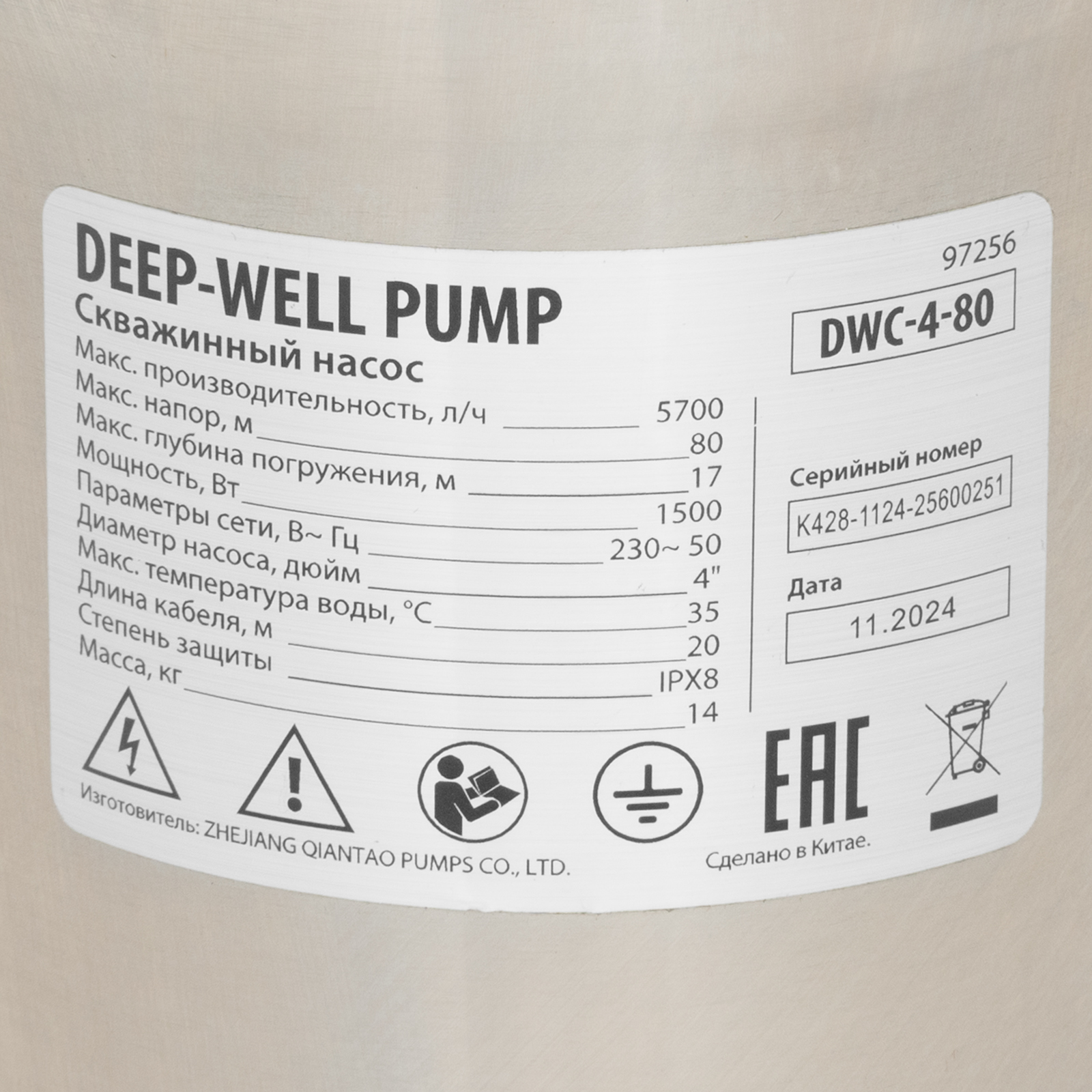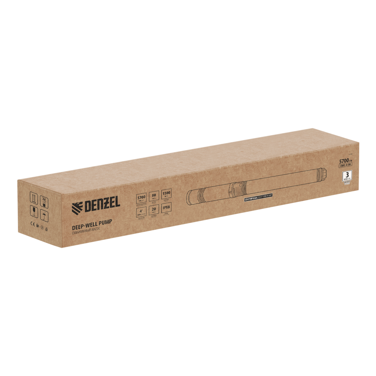 Скважинный насос DWC-4-80, центробежный, диаметр 4", 1500 Вт, 5700 л/ч, напор 80 м Denzel в Воронеже