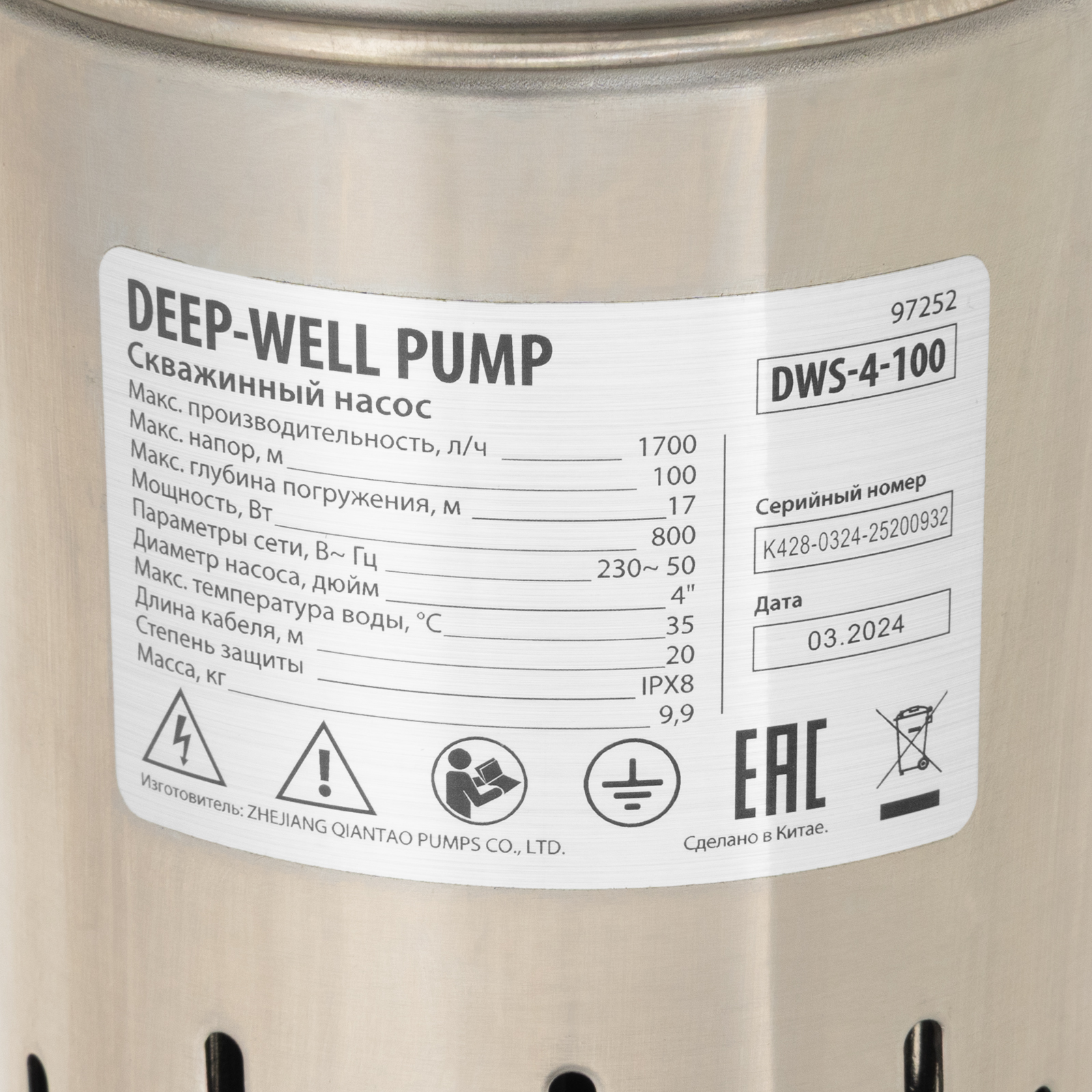 Скважинный насос Denzel DWS-4-100 97252 производительностью 1700 л/ч, диаметром 4″ и мощностью 800 Вт обеспечивает напор до 100 м. Предназначен для подачи чистой воды из скважин, колодцев, систем водоснабжения, различных накопителей и пресных водоемов с глубины до 17 м (с наращиванием кабеля — до 80 м). Винтовая насосная часть обеспечивает напор, достаточный не только для полива приусадебных участков, но и для организации бытового водоснабжения.