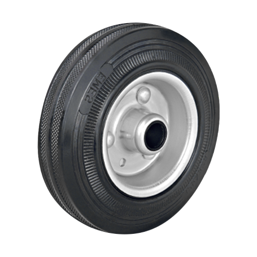 Грузоподъемность промышленного колеса SPR150 составляет 130 кг, диаметр — 150 мм. Контактный слой изготовлен из литой черной резины, обод — из оцинкованной стали. Модель подходит для установки на различное складское и строительное оборудование, контейнеры ТБО, может использоваться на поверхностях с уклонами и неровностями, во влажной среде.