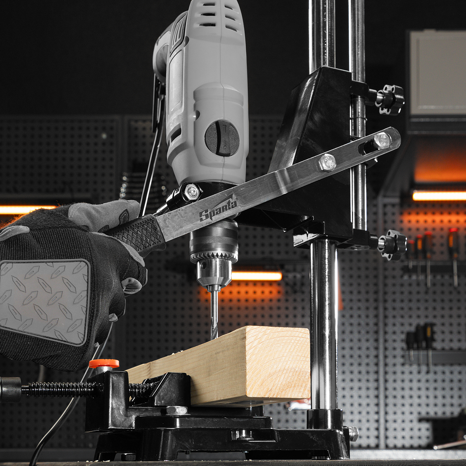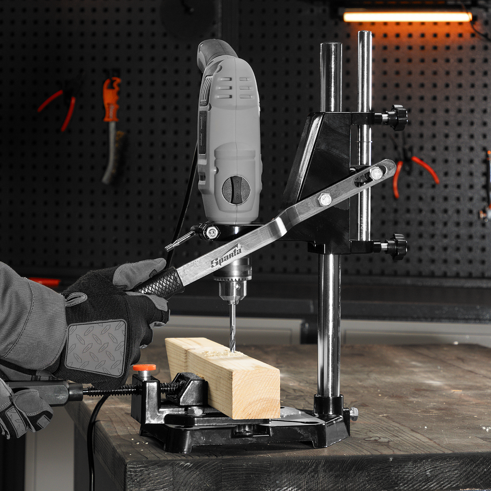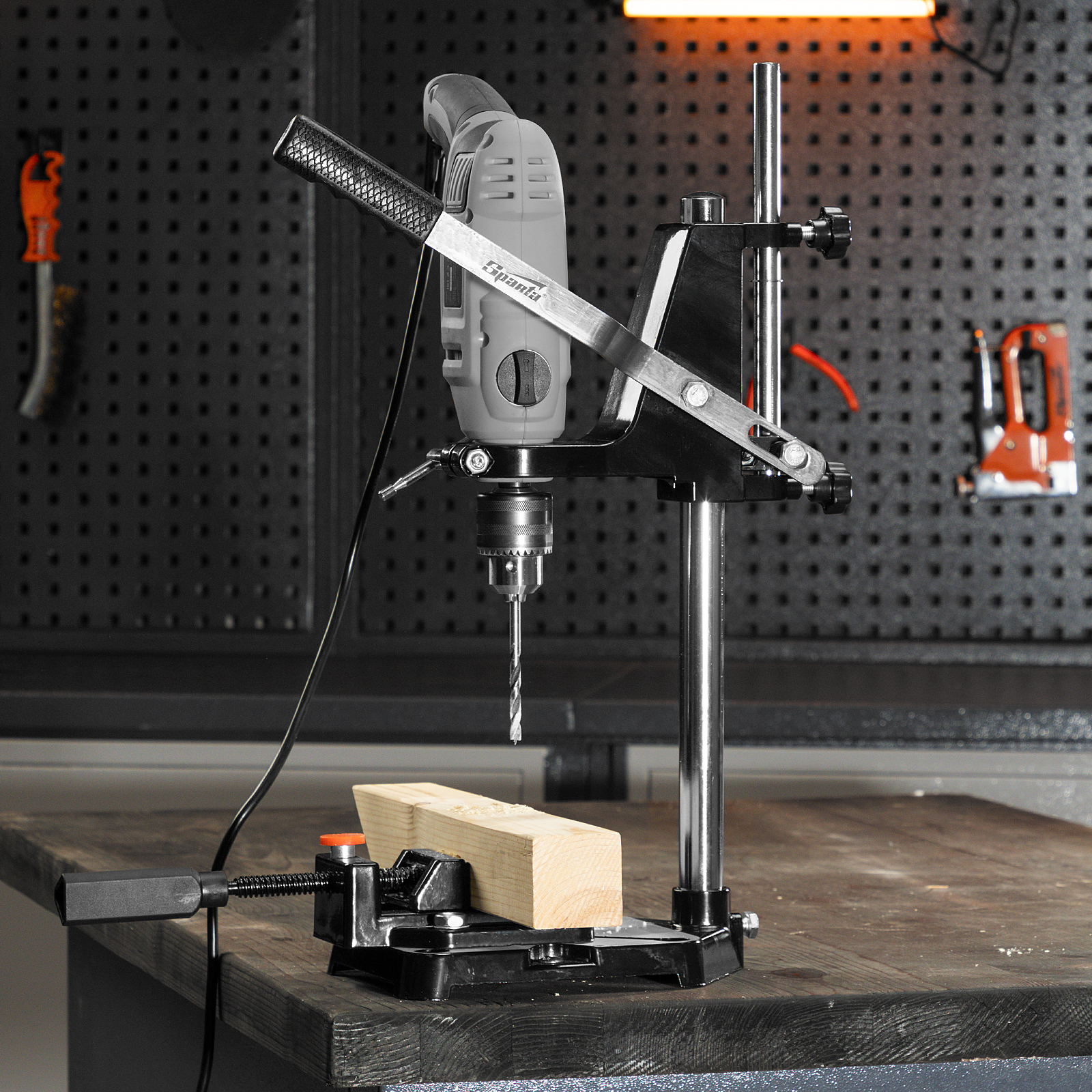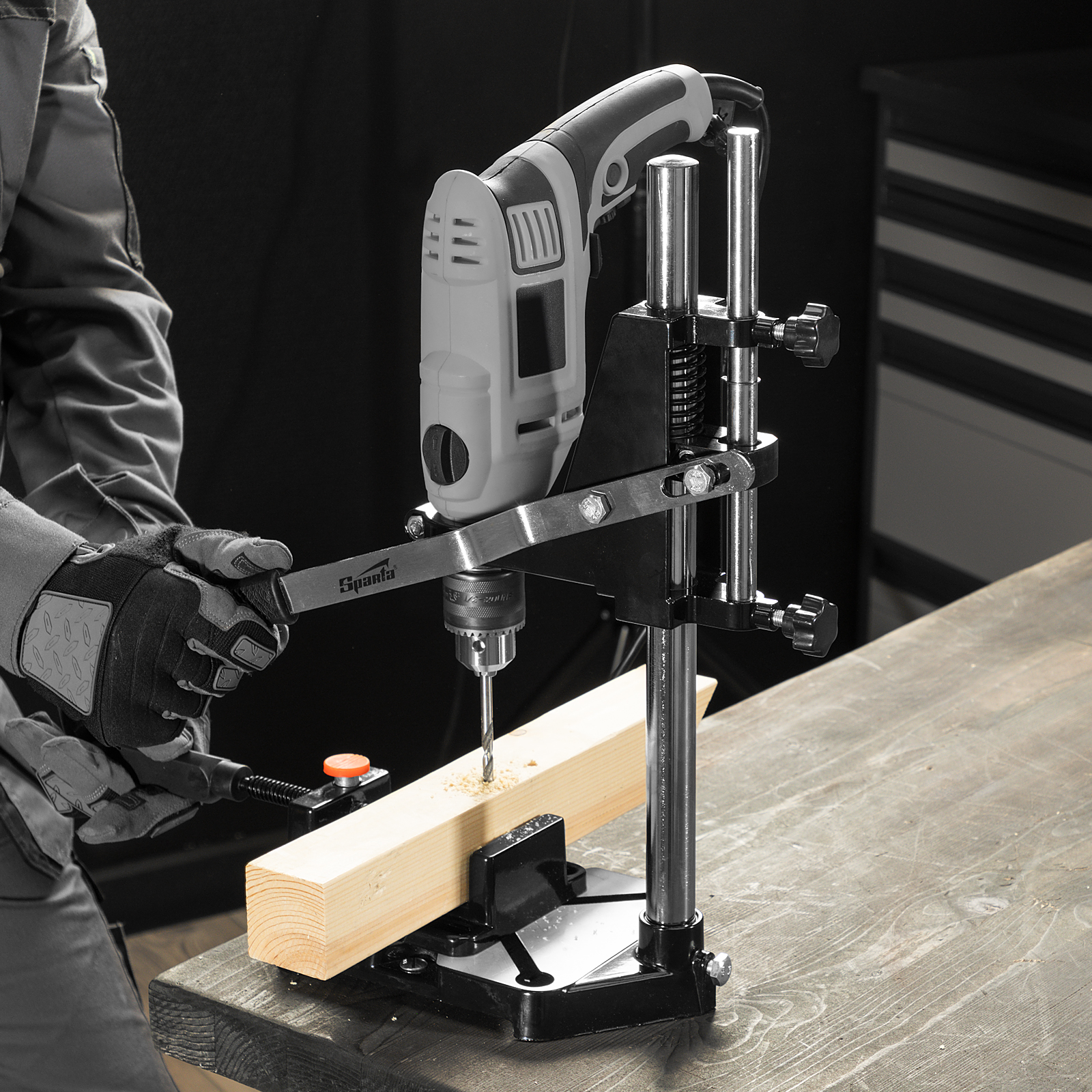 Станок Sparta 934055 с тисками позволяет закрепить дрель в вертикальном положении и использовать ее в качестве сверлильного станка. Он существенно облегчает работу с дрелью, позволяет использовать ее для фрезерования, а также способствует увеличению скорости и точности работы.