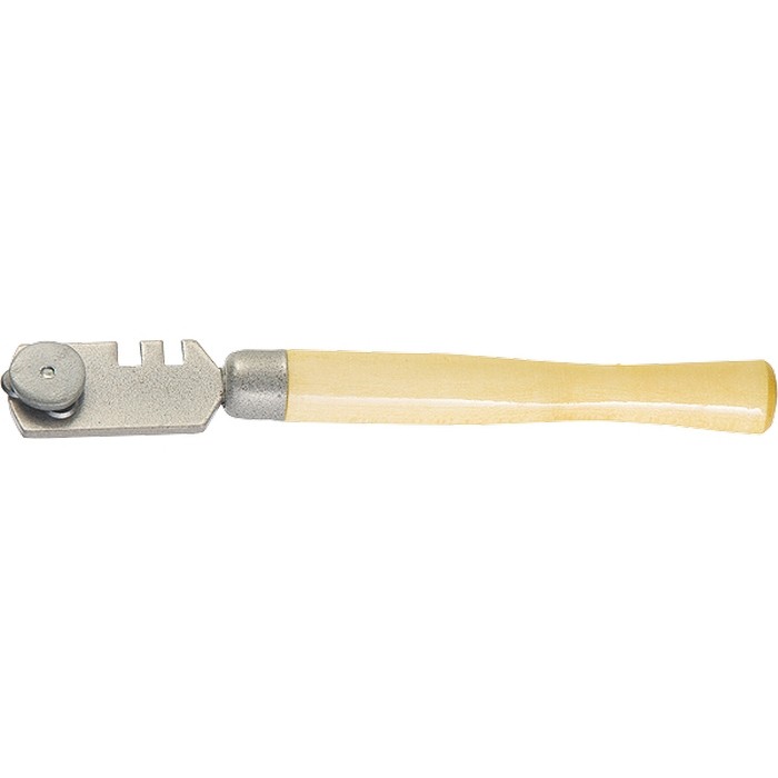 Трехроликовый стеклорез 87217 с деревянной рукояткой используется для резки стекла и зеркал толщиной до 7 мм. Наличие 3 роликов позволяет быстро восстановить работоспособность инструмента в случае износа режущего элемента — достаточно ослабить винт и повернуть блок, установив в рабочее положение новый ролик. На головке имеются пазы шириной 3 и 4 мм, при помощи которых можно отделить тонкую полоску стекла или удалить излишки материала, если разлом отошел от линии разметки. Стеклорез подходит для бытового использования.