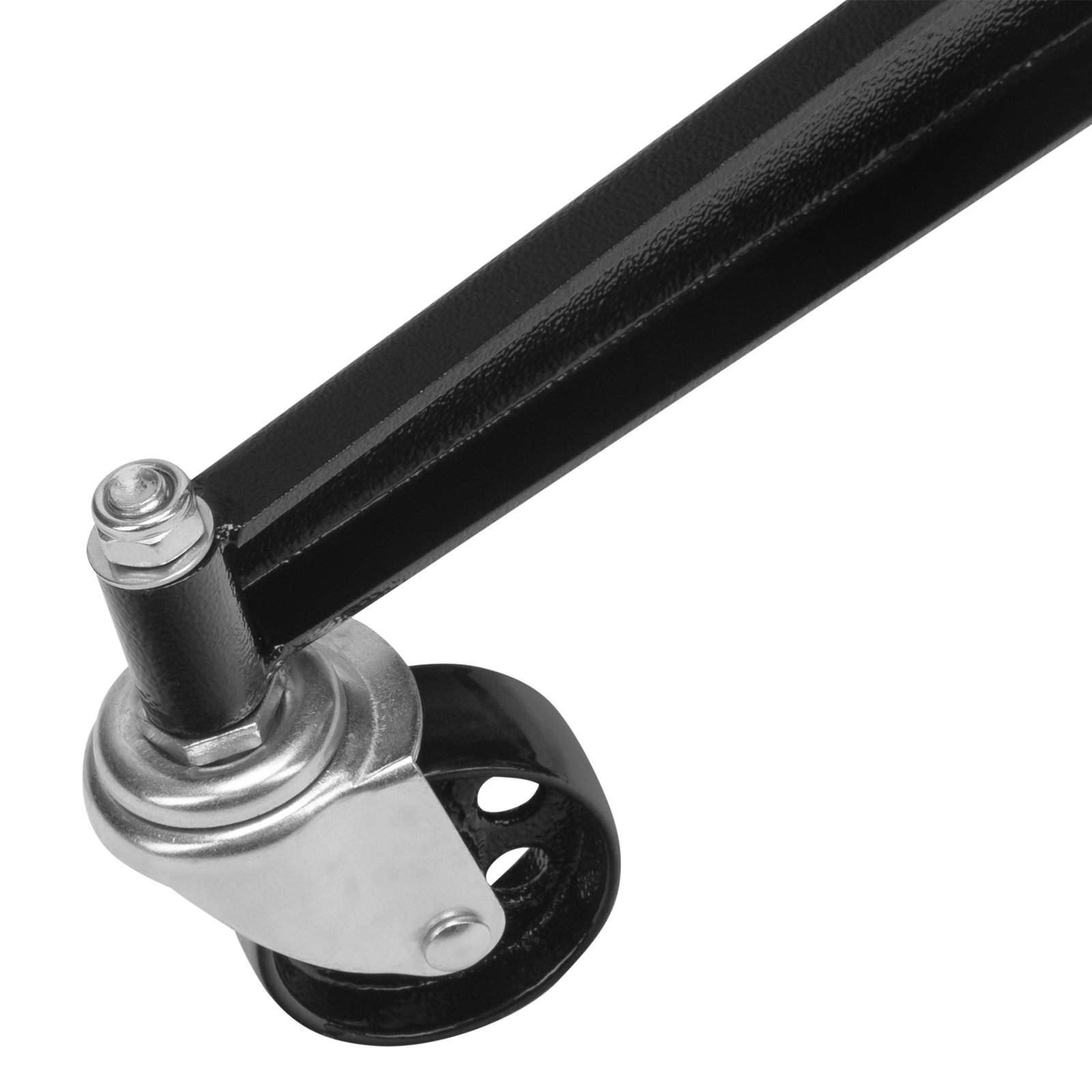 - Продуманная конструкция — колеса позволяют перемещать стойку по рабочей площадке, а стопорные педали — фиксировать ее на одном месте.