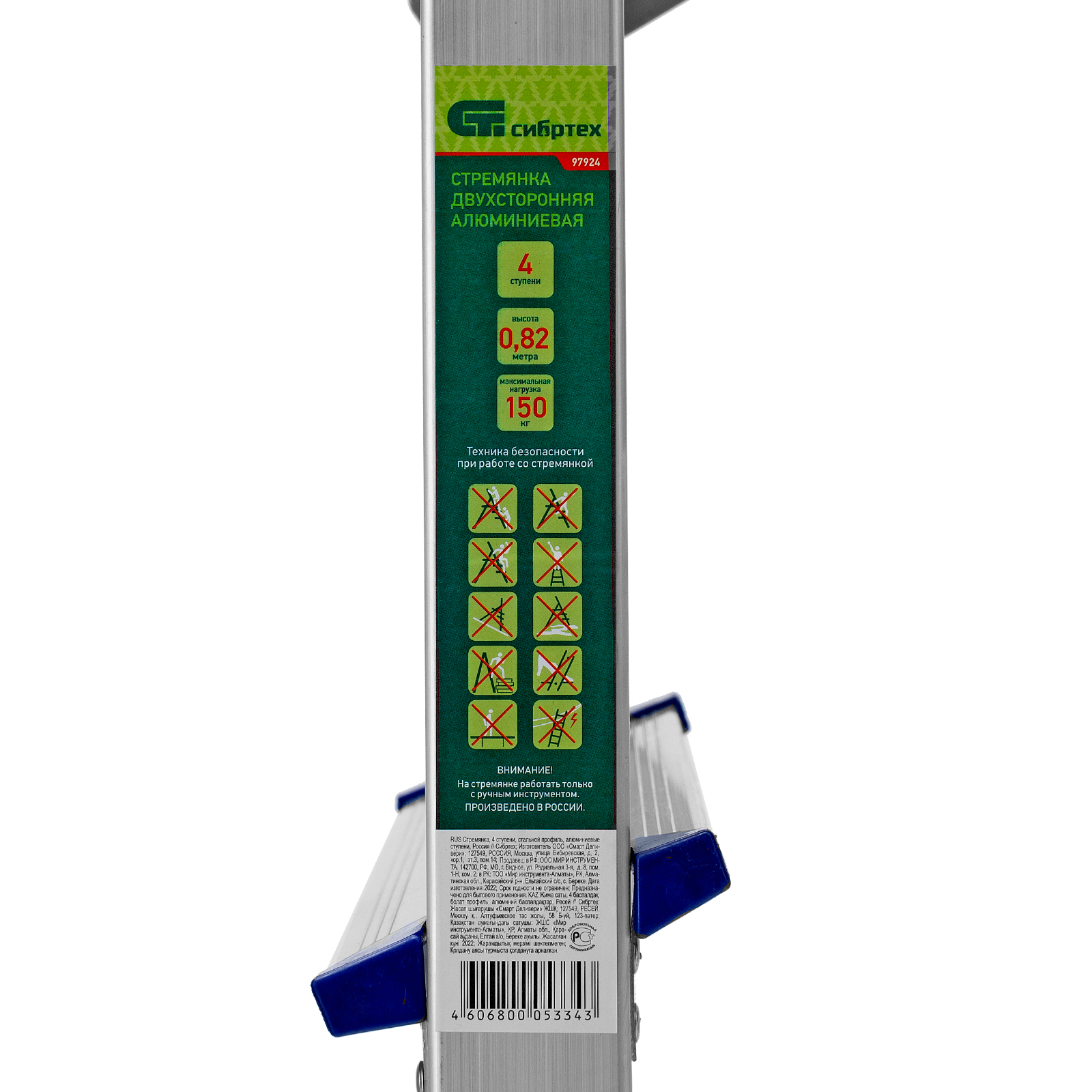 Стремянка двусторонняя алюминиевая Сибртех 97924 с 4 ступенями позволяет выполнять различные действия на высоте — штукатурить или красить стены, менять лампочки, вытирать пыль, доставать нужные предметы с верхних полок. Площадка находится на высоте 82,8 см от опорной поверхности, рабочая высота стремянки составляет 282,8 см (при среднем росте пользователя 170 см).