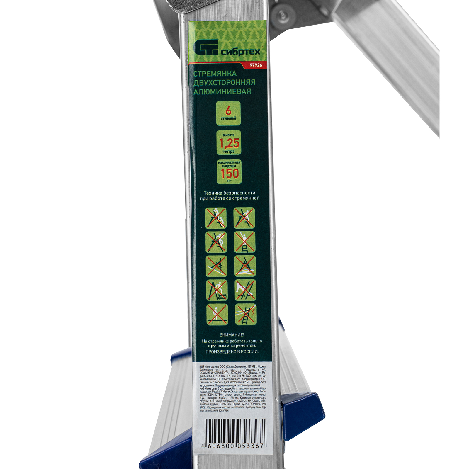 Стремянка двусторонняя алюминиевая Сибртех 97926 с 6 ступенями позволяет выполнять различные действия на высоте — штукатурить или красить стены, менять лампочки, вытирать пыль, доставать нужные предметы с верхних полок. Площадка находится на высоте 125,3 см от опорной поверхности, рабочая высота стремянки составляет 325,3 см (при среднем росте пользователя 170 см).
