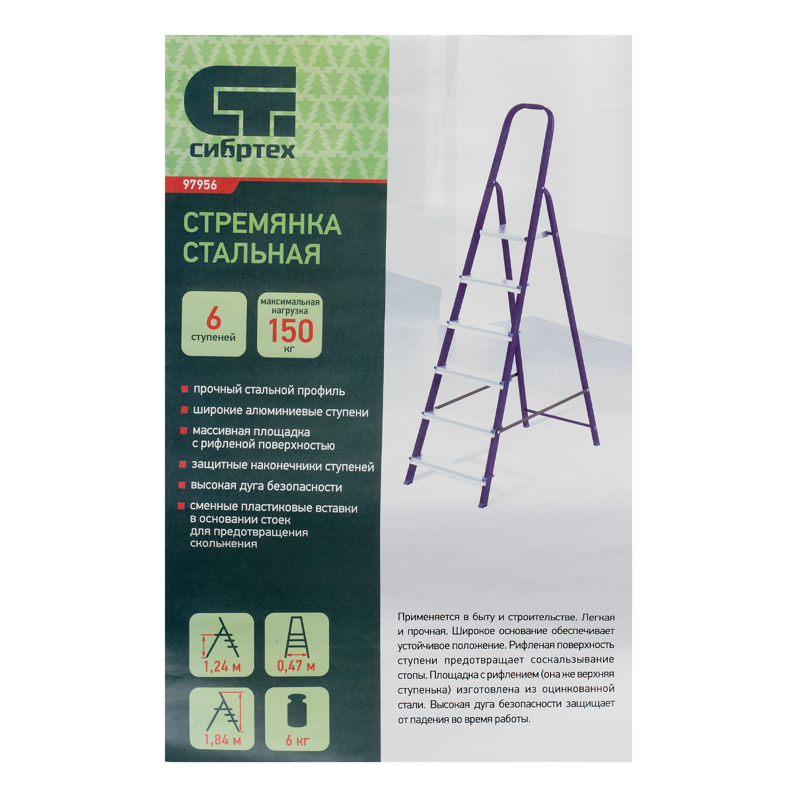 Стремянка Сибртех 97956 со стальным профилем и 6 ступенями, 5 из которых алюминиевые, упрощает доступ к предметам, расположенным на антресолях, шкафах, высоких полках. Также будет полезна для проведения отделочных и монтажных работ. Лестница обладает высокой прочностью при весе 6,8 кг и выдерживает нагрузку до 150 кг. Площадка находится на высоте 123 см от опорной поверхности, рабочая высота стремянки составляет 323 см (при среднем росте пользователя 170 см).