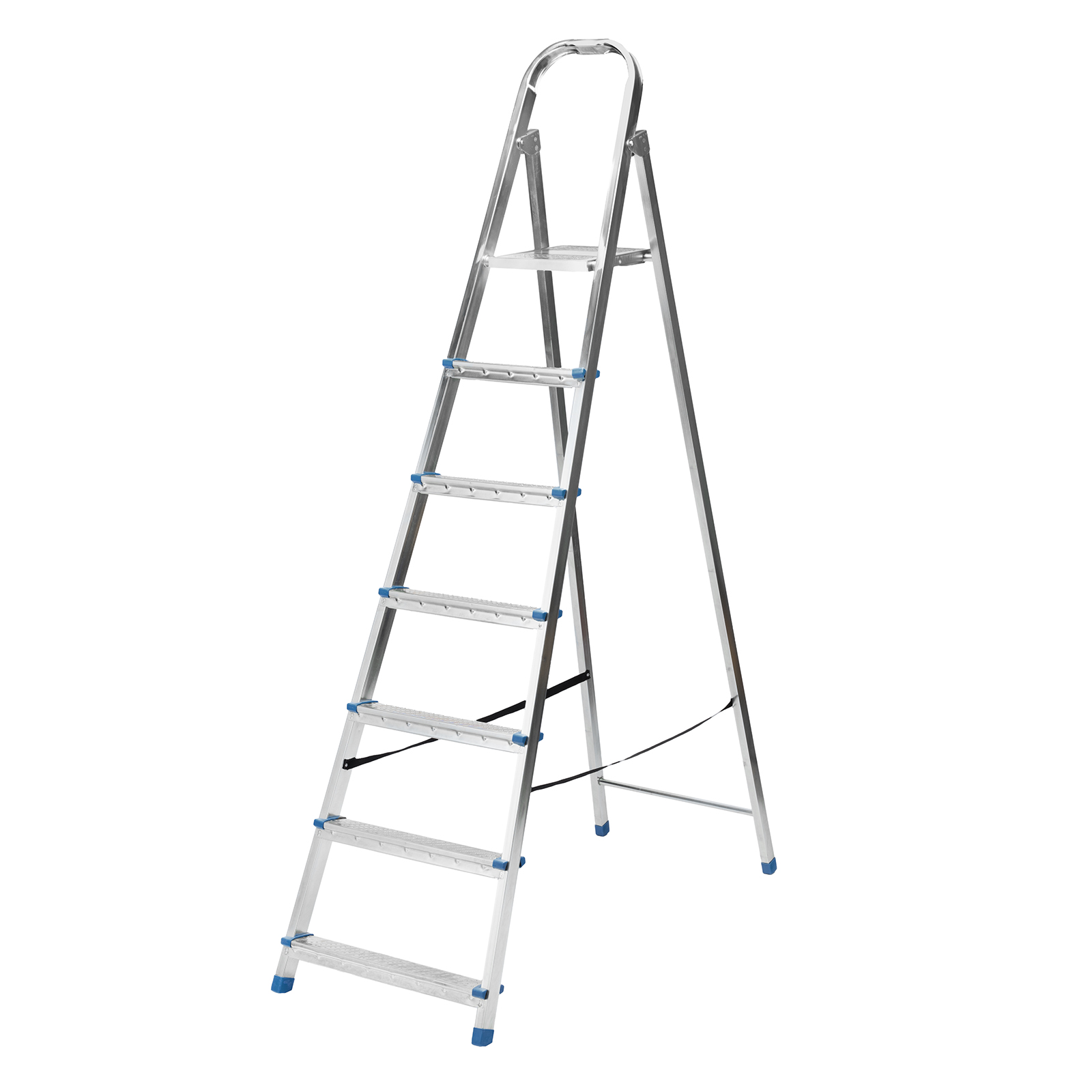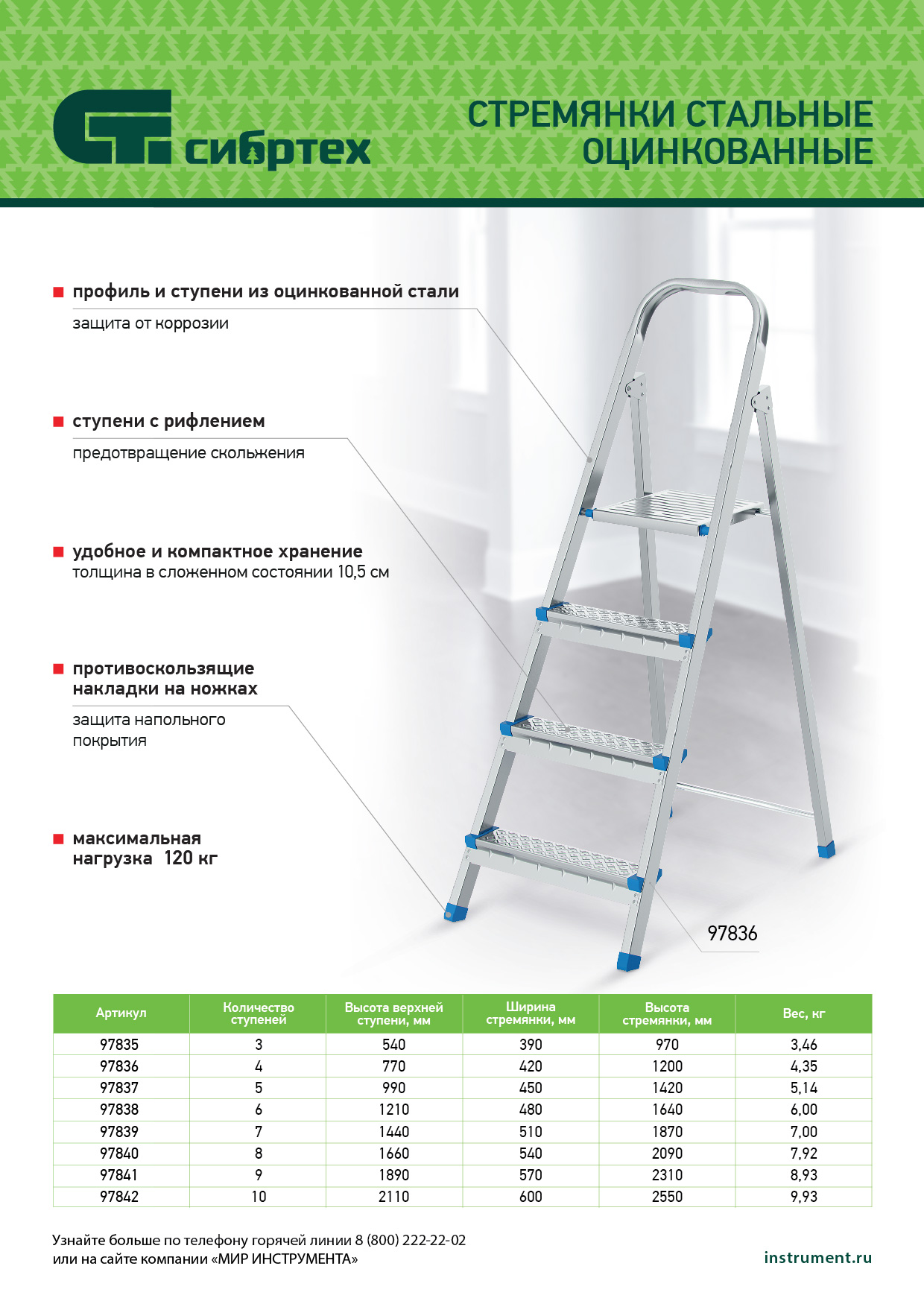 Стальная оцинкованная стремянка Сибртех 97839 с 7 ступенями позволяет повесить полку, картину или шкафчик, достать нужный предмет и решить другие задачи, для которых требуется доступ к предметам на высоте. Рама и ступени из стального профиля выдерживают вес до 120 кг. Расстояние от опорной поверхности до площадки составляет 143,5 см, при среднем росте пользователя 170 см рабочая высота лестницы — 343,5 см. Необходимо соблюдать технику безопасности: размещать стремянку только на ровной плоскости и не использовать ее для работы с дрелью, шуруповертом и другим электроинструментом.