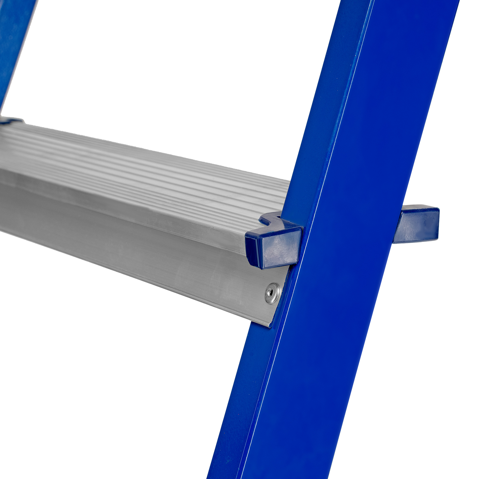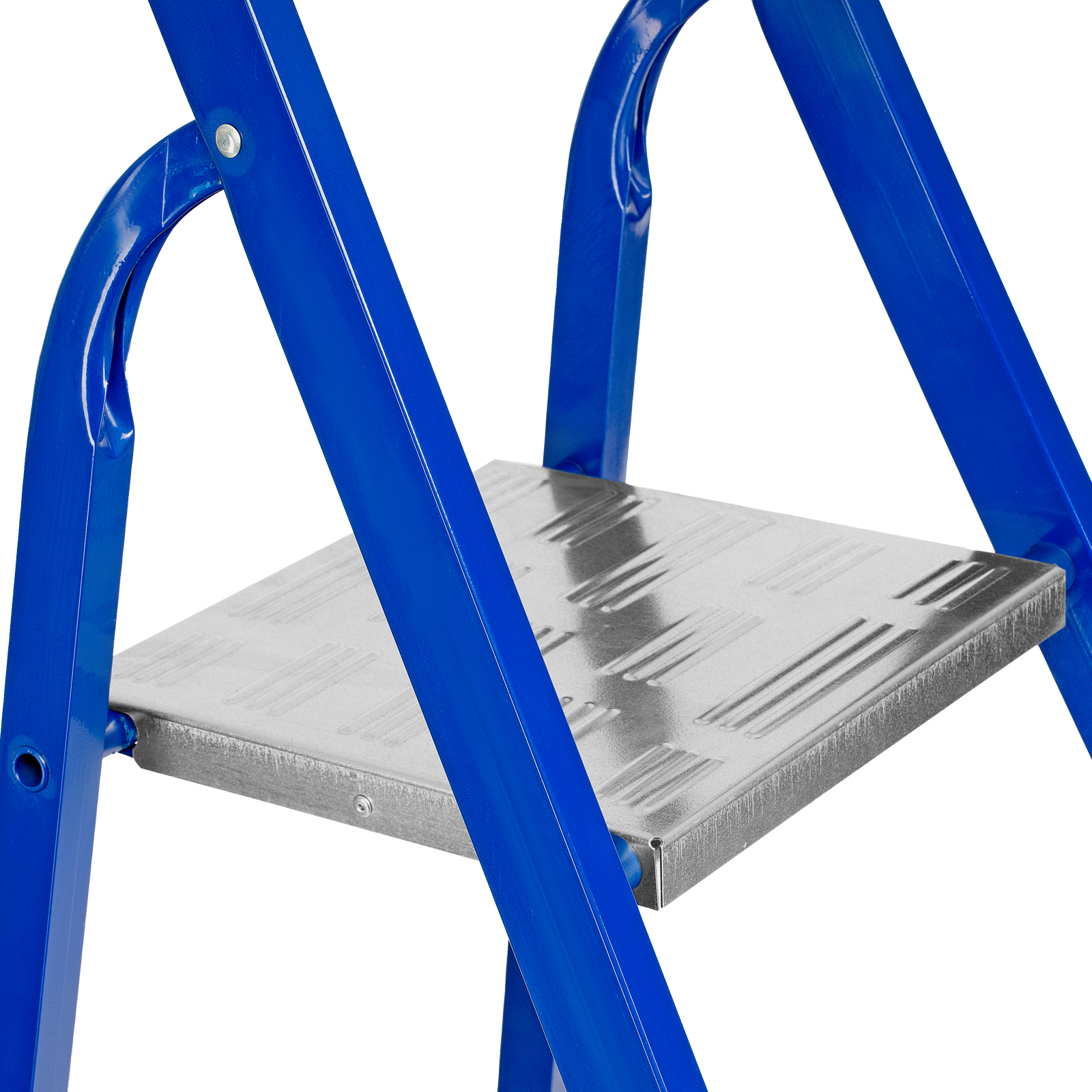 Стремянка Сибртех 97959 со стальным профилем и 9 ступенями, 8 из которых алюминиевые, упрощает доступ к предметам, расположенным на антресолях, шкафах, высоких полках. Также будет полезна для проведения отделочных и монтажных работ. Лестница обладает высокой прочностью при весе 9,3 кг и выдерживает нагрузку до 150 кг. Площадка находится на высоте 188,4 см от опорной поверхности, рабочая высота стремянки составляет 388,4 см (при среднем росте пользователя 170 см).