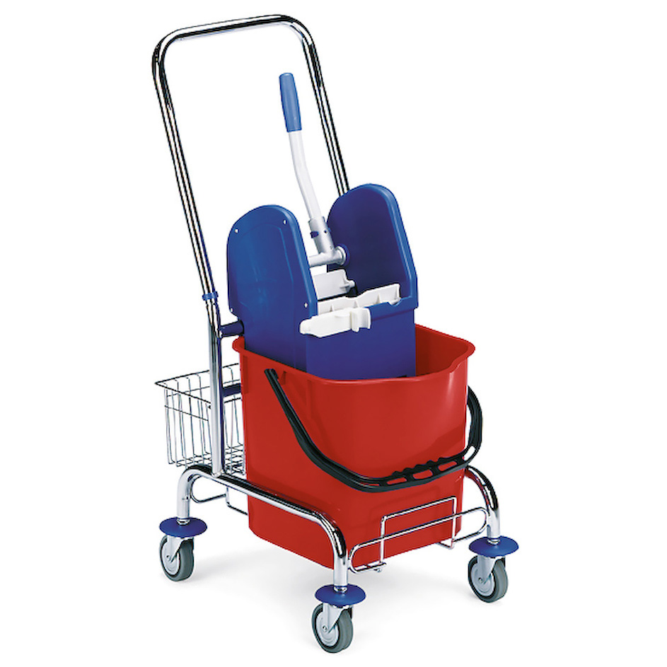 Хромированная рама с П-образной ручкой, 4 роликовыми колесиками Ø80 мм и 4 противоударными бамперами Ведро из ударопрочного пластика 25 л, красное Универсальный отжим для МОПОв Хромированная корзина