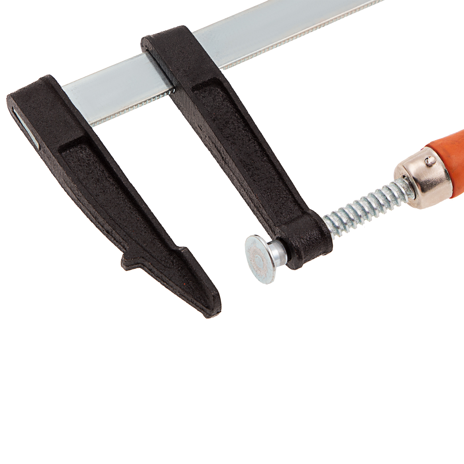 F-образная струбцина Sparta 204335, 400 х 80 х 460 мм, используется в столярном и слесарном деле и позволяет фиксировать заготовки из металла, древесины и других материалов для их соединения или обработки. Деталь помещают между губками, одна из которых подвижна и служит для регулировки величины захвата. Винтовой зажим позволяет прикладывать значительное усилие для надежной фиксации. Защитные накладки предотвращают повреждение детали. Элементы конструкции выдерживают высокую температуру, поэтому струбцина подходит для проведения сварочных работ, при этом пластиковые накладки необходимо снять.