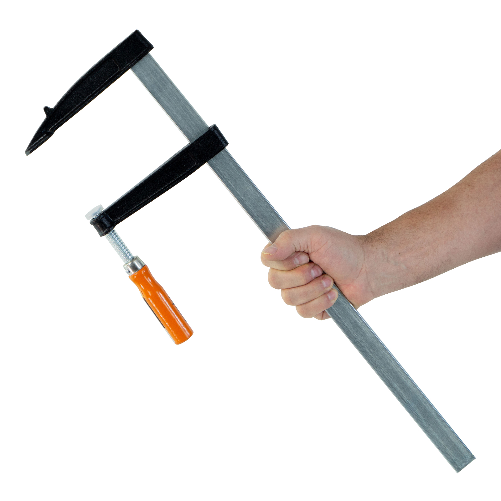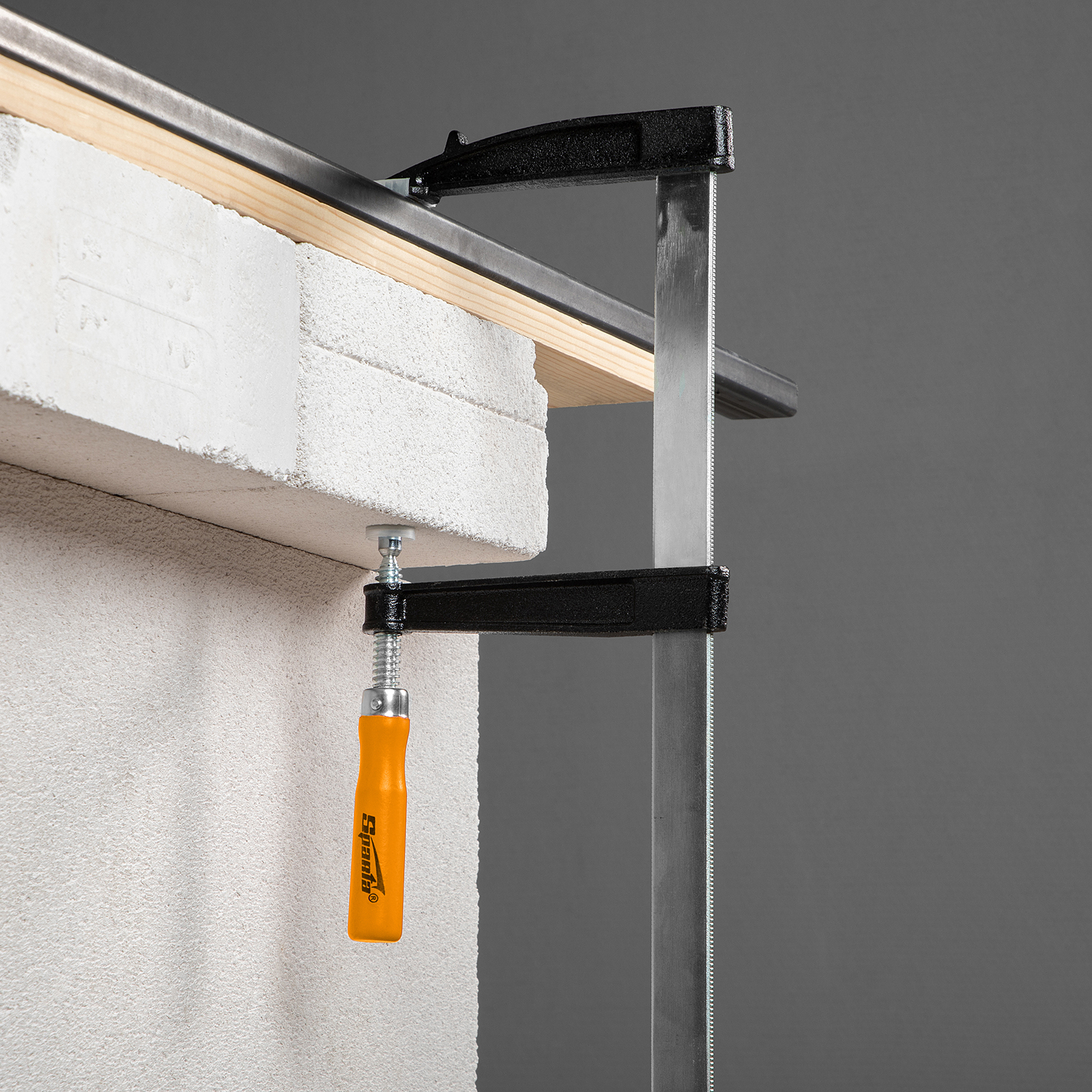 F-образная струбцина Sparta 204415, 500 х 120 х 570 мм, используется в столярном и слесарном деле и позволяет фиксировать заготовки из металла, древесины и других материалов для их соединения или обработки. Деталь помещают между губками, одна из которых подвижна и служит для регулировки величины захвата. Винтовой зажим позволяет прикладывать значительное усилие для надежной фиксации. Защитные накладки предотвращают повреждение детали. Элементы конструкции выдерживают высокую температуру, поэтому струбцина подходит для проведения сварочных работ, при этом пластиковые накладки необходимо снять.