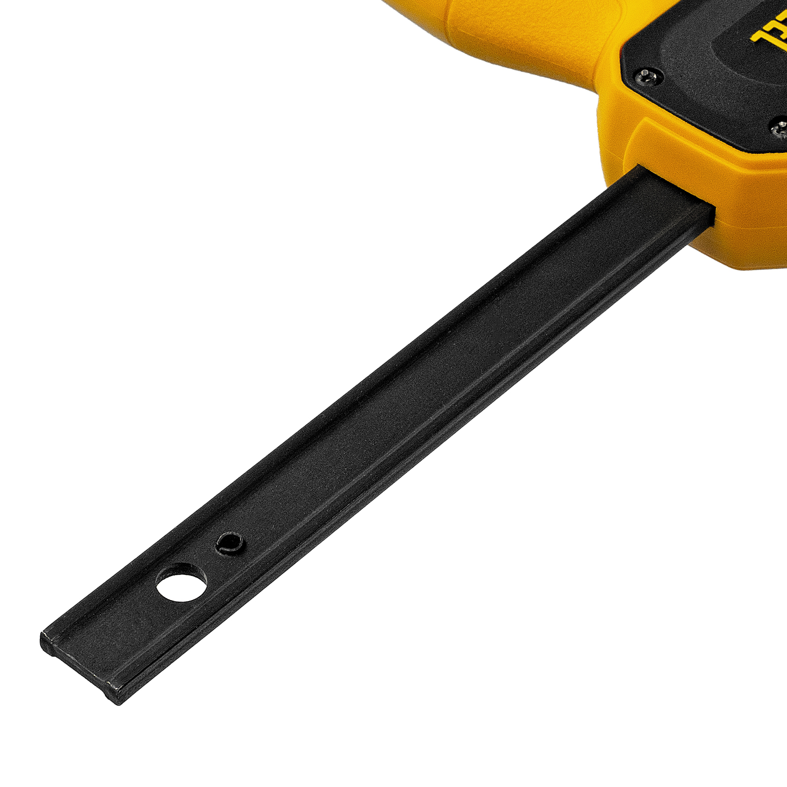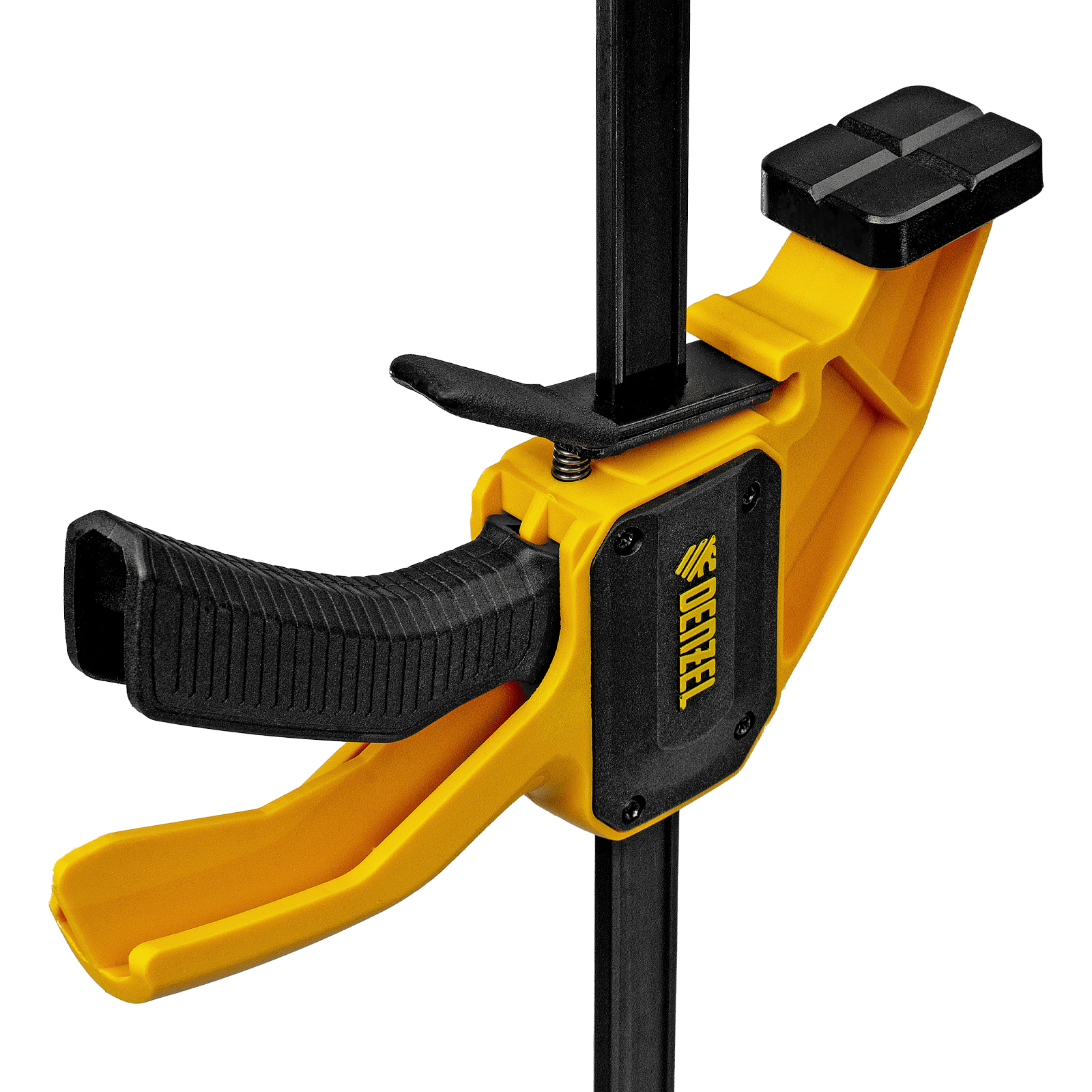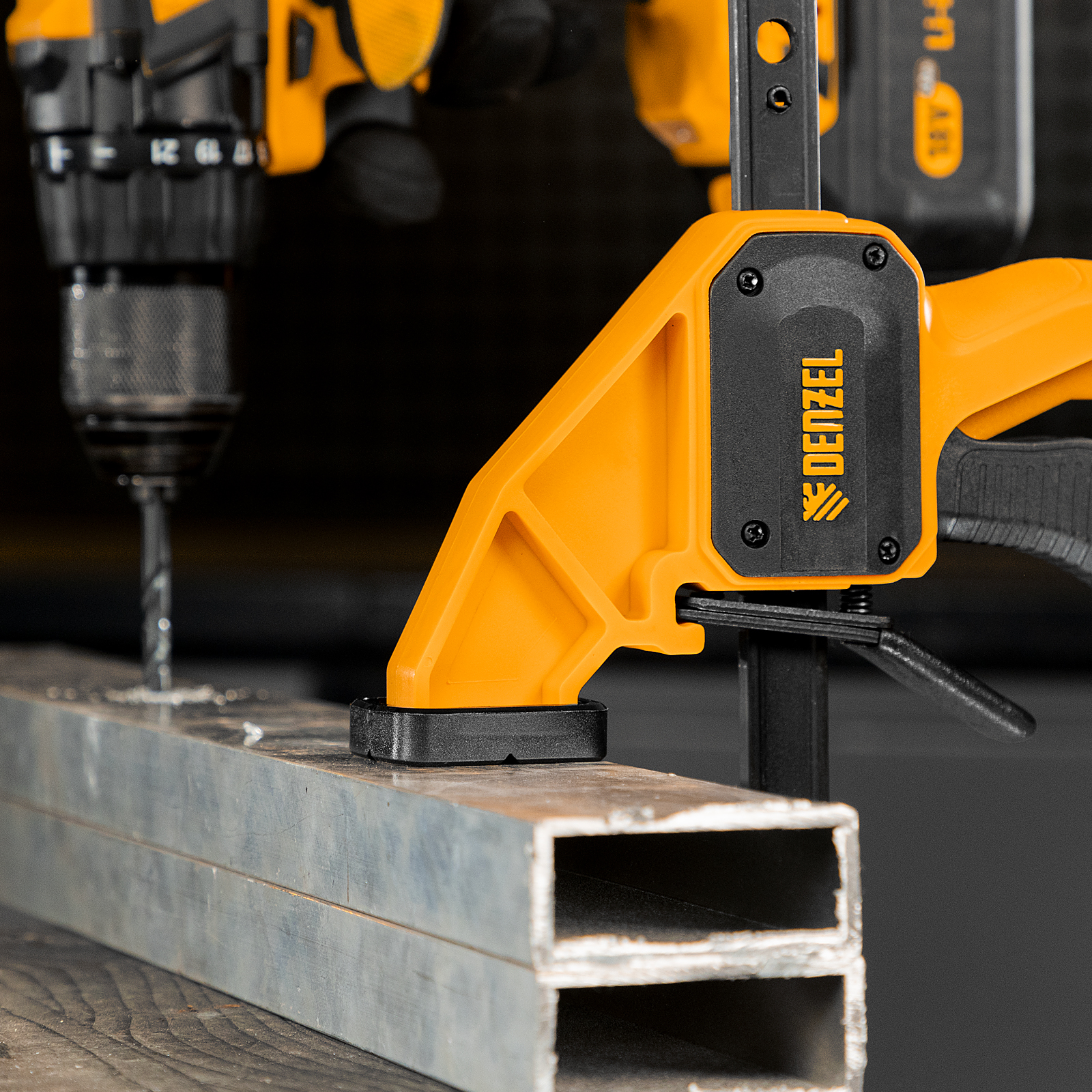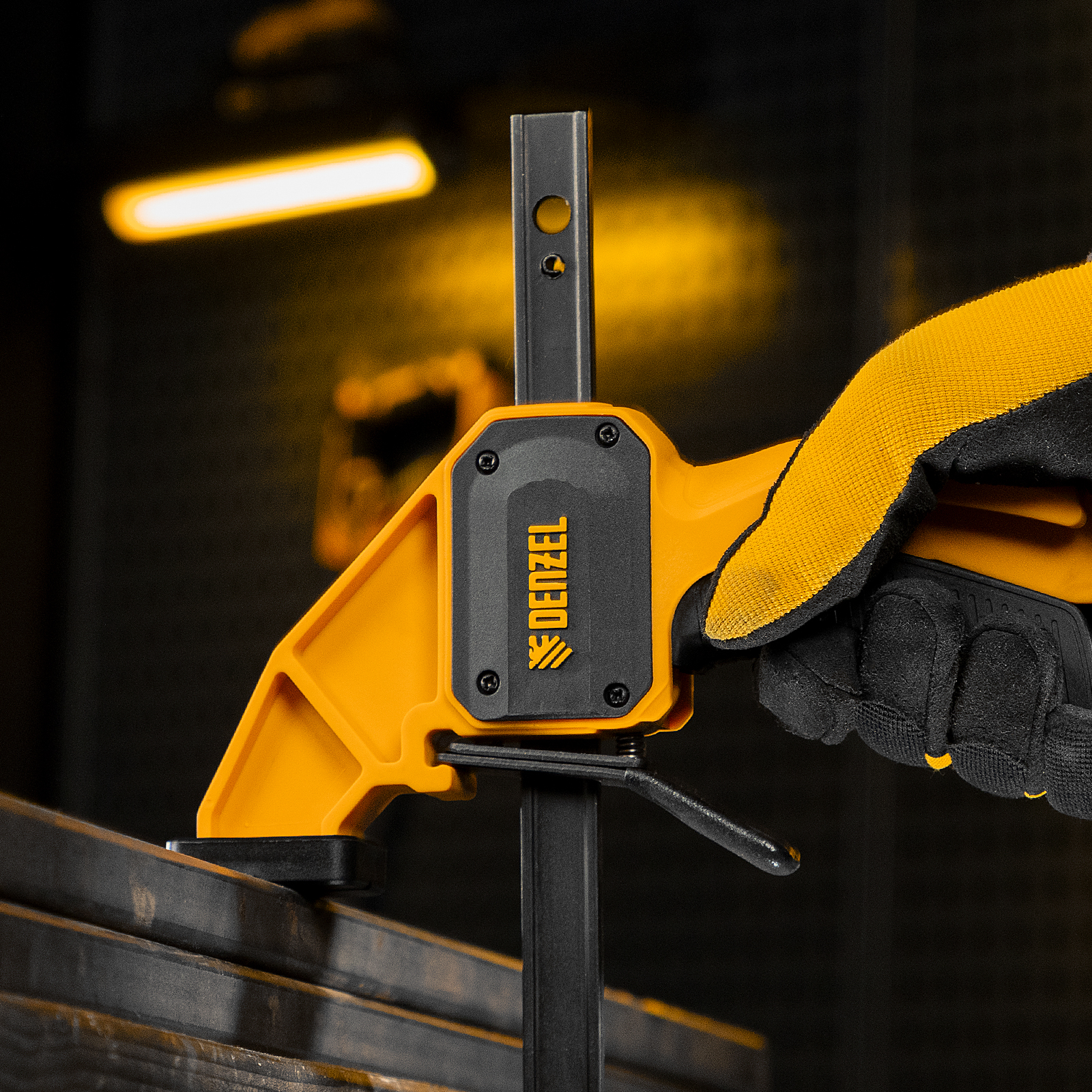- Комфортное использование — струбцина весит всего 560 г, обрезиненная кнопка фиксации обеспечивает удобный захват.