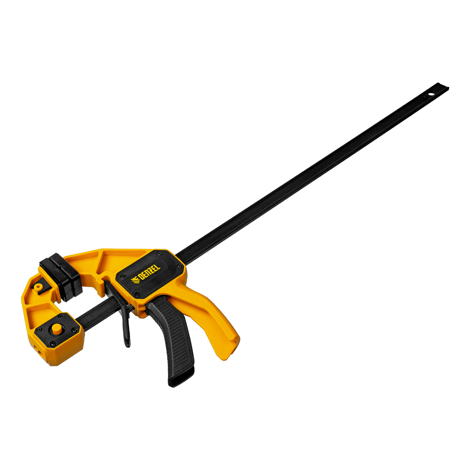 - Комфортное использование — струбцина весит всего 710 г, обрезиненная кнопка фиксации обеспечивает удобный захват.