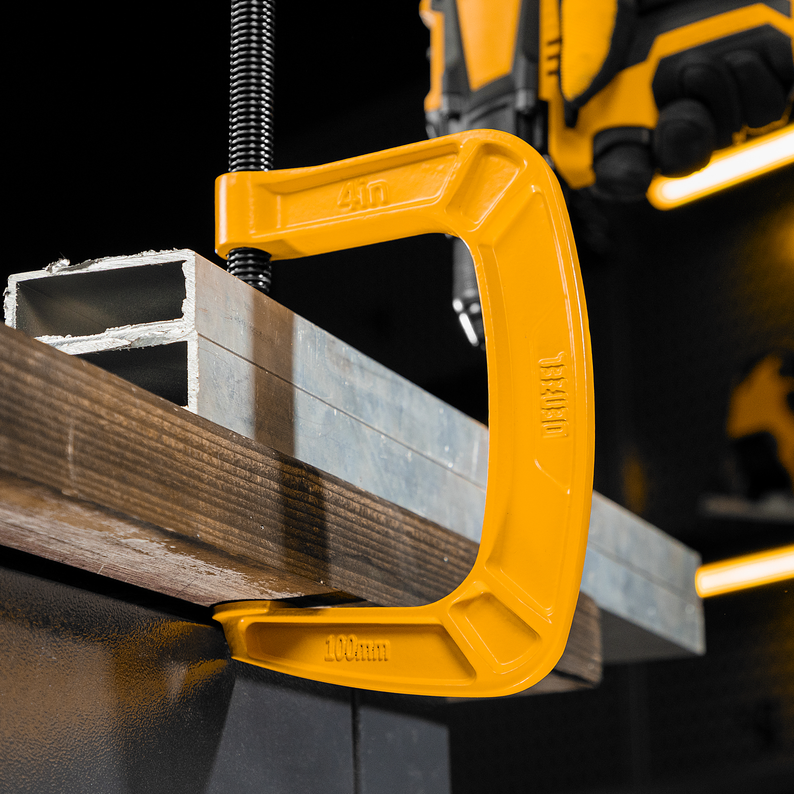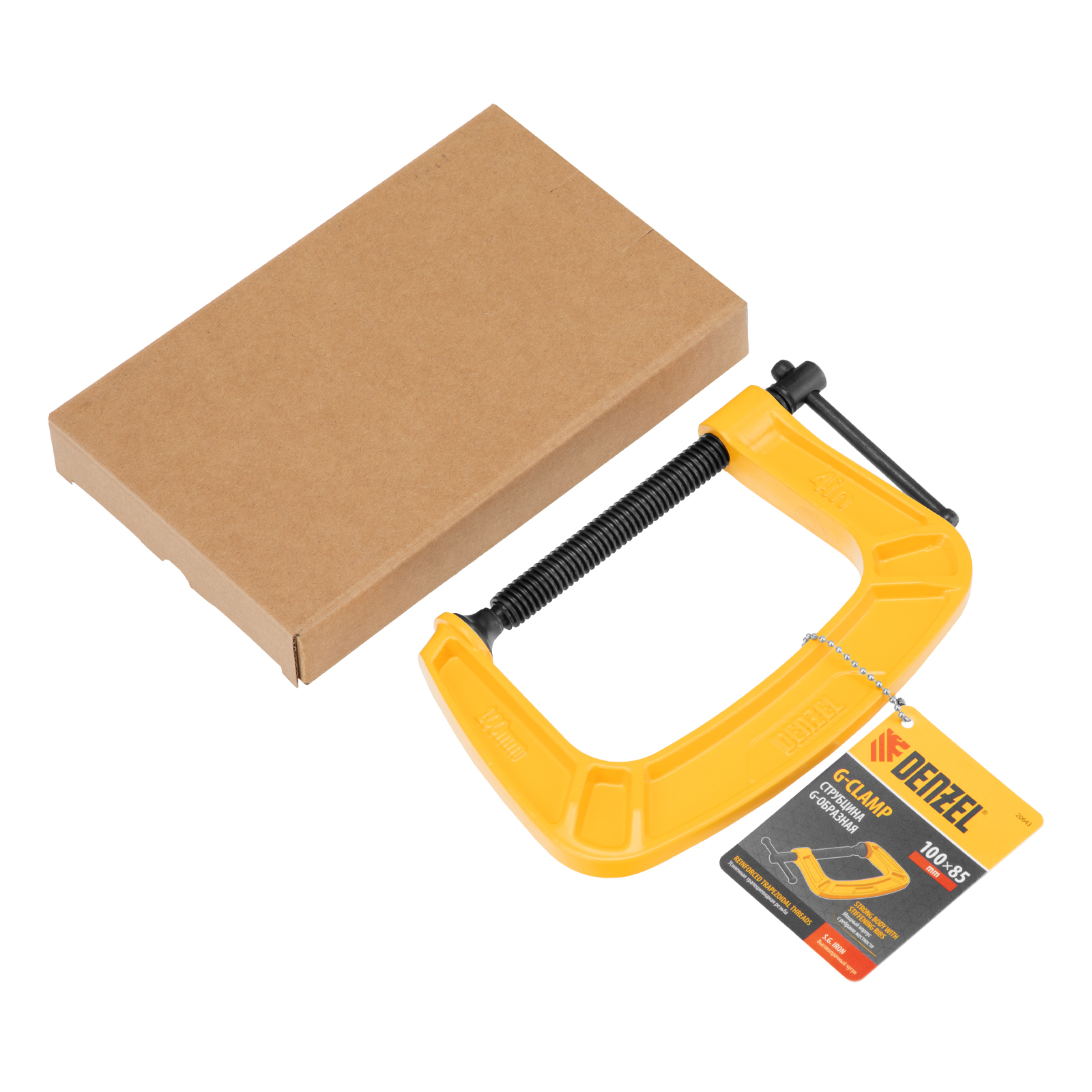 G-образная струбцина Denzel 20643 с максимальной шириной зажима 100 мм используется для фиксации заготовок или закрепления их на верстаке, станке или между собой. Позволяет склеивать детали, а также сверлить их, шлифовать, опиливать и проводить другие работы. Может использоваться во время выполнения сварочных работ. Винт с трапециевидной резьбой обеспечивает надежную фиксацию предметов. Струбцина применяется в слесарном и столярном деле, будет полезна также домашнем хозяйстве.