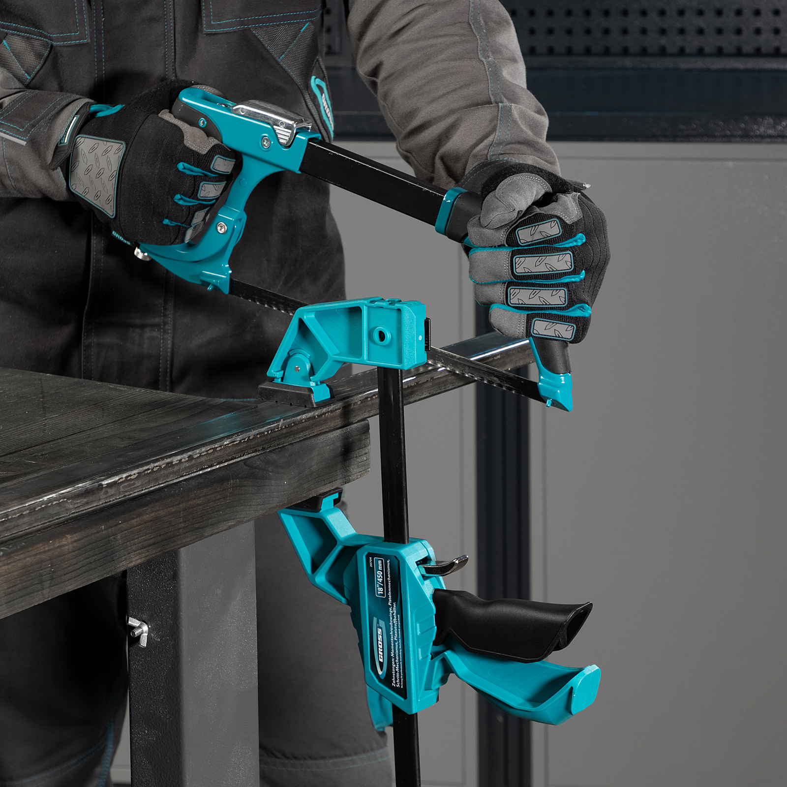 - Устойчивость к высоким нагрузкам — корпус и губки изготовлены из ударопрочного пластика, а шина — из углеродистой стали.