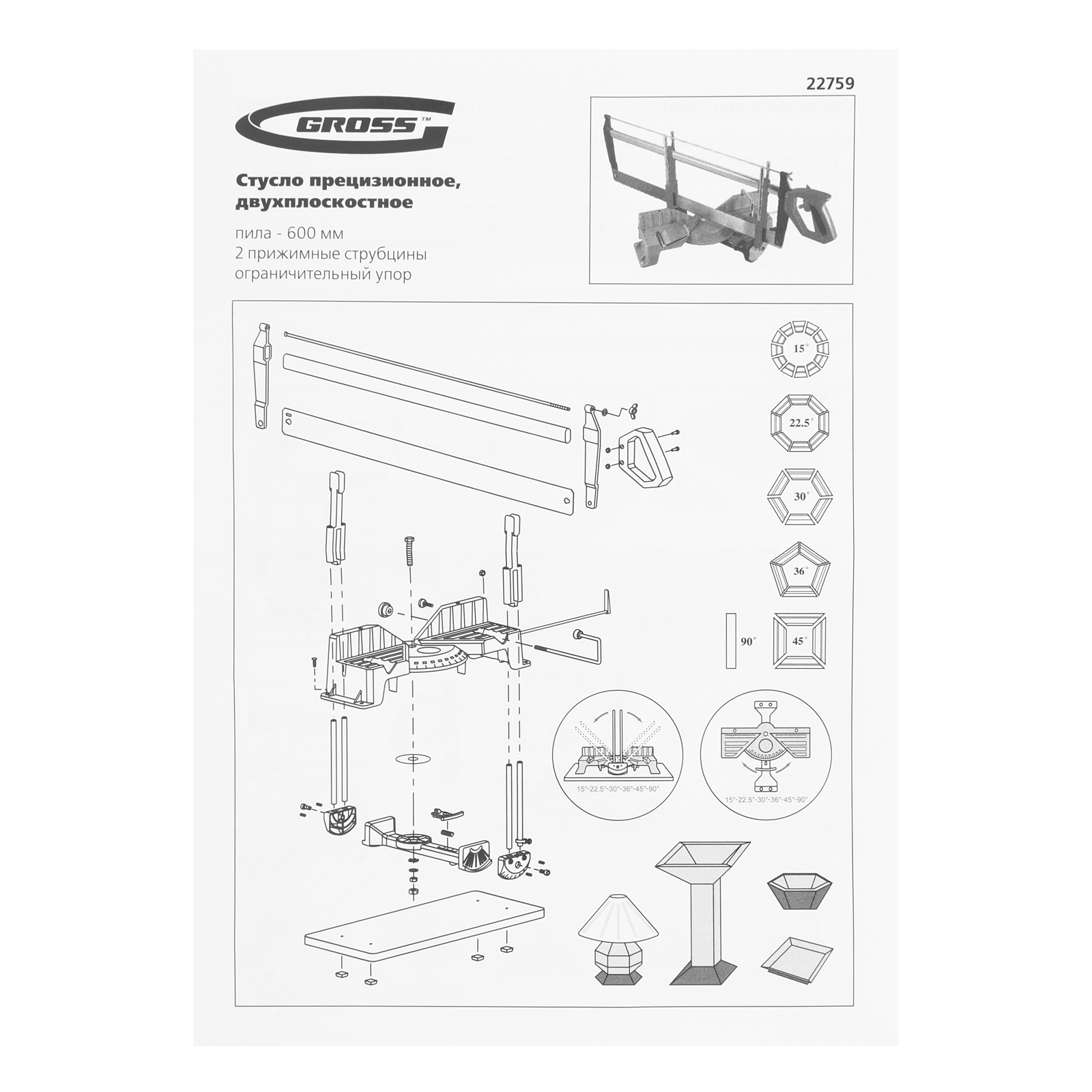 Двухплоскостное прецизионное стусло Gross 22759 с пилой 600 мм, 2 прижимными струбцинами и ограничительным упором позволяет осуществлять распил заготовок в двух плоскостях. Оно обеспечивает высоту распила 165 мм и ширину 175 мм. Рассчитано на профессиональное использование при проведении столярных работ.