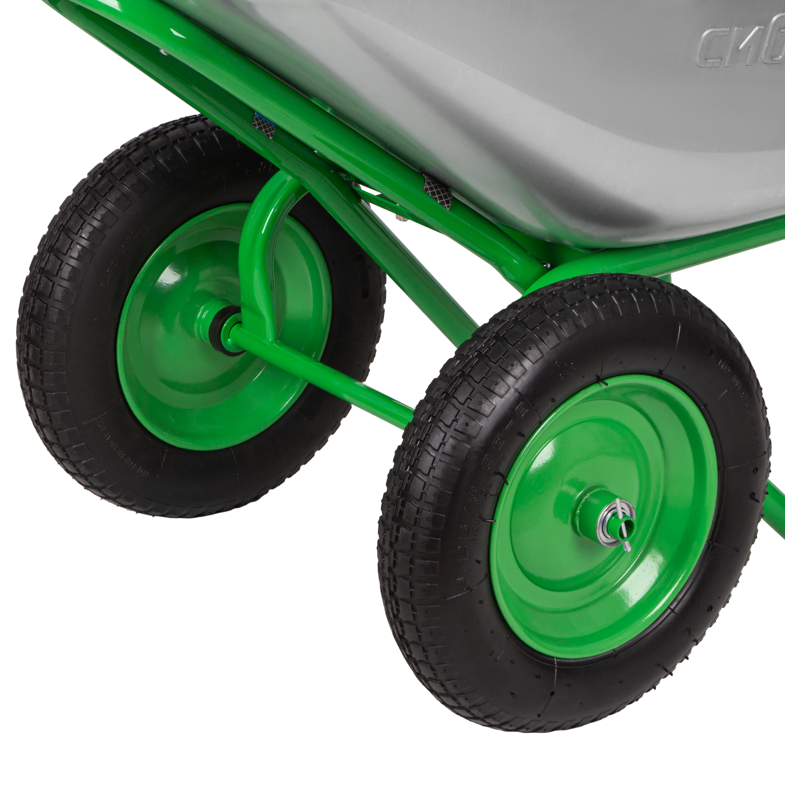 Двухколесная садово-строительная тачка Сибртех 689643 грузоподъемностью 230 кг, с объемом кузова 90 л, предназначена для перемещения грузов во время работы на строительной площадке или в саду. В ней можно перевозить грунт, щебень или строительные смеси. 2 колеса обеспечивают высокую грузоподъемность, а также устойчивость во время движения по прямой и на поворотах. Вес груза распределяется равномерно, поэтому тачка не проваливается даже в рыхлый грунт.
