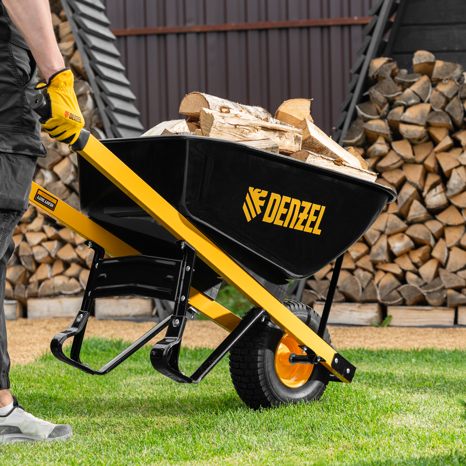 - Устойчивость — тачка не проваливается в грунт благодаря широкому пневмоколесу и подпятникам на ножках.