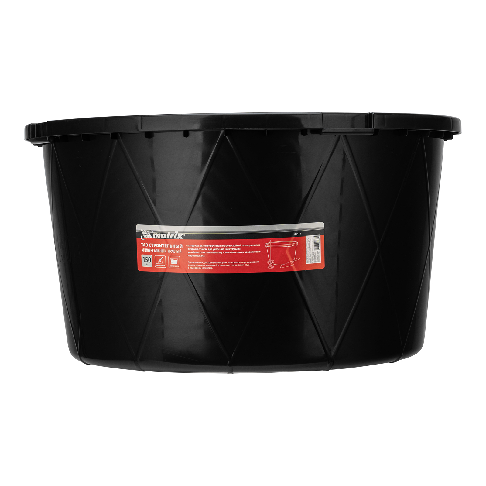 Круглый строительный ударопрочный таз Matrix 81474 с ребрами жесткости, объемом 150 л, универсален в применении: он используется для перемешивания строительных смесей, хранения сыпучих материалов и воды для технических нужд. Будет полезен во время проведения строительно-отделочных работ, пригодится также в подсобном хозяйстве и на огороде.