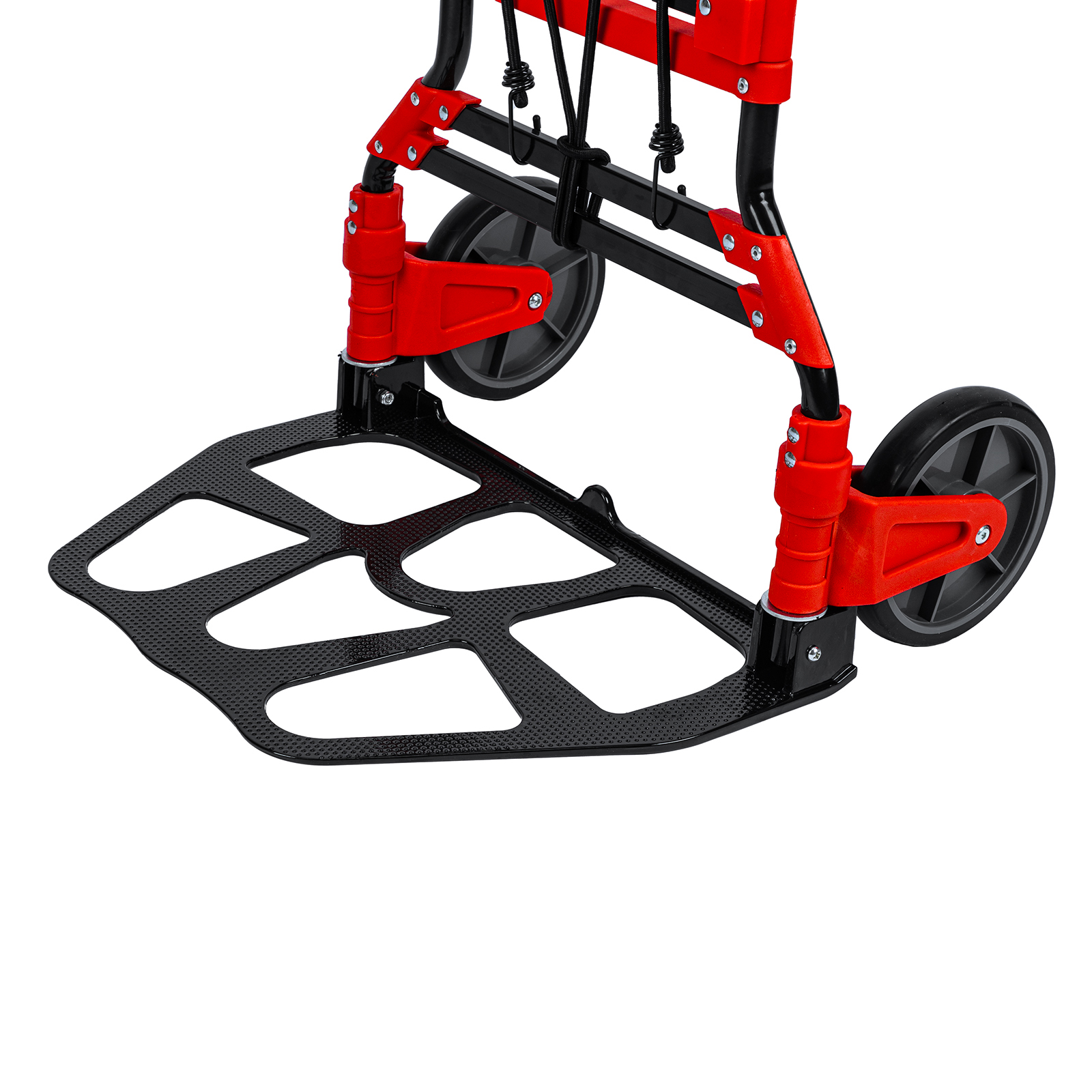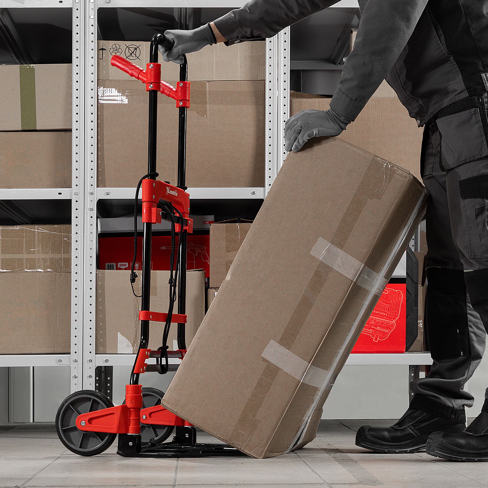 - Удобное хранение и транспортировка — платформа и колеса складываются, поэтому тележка не занимает много места.