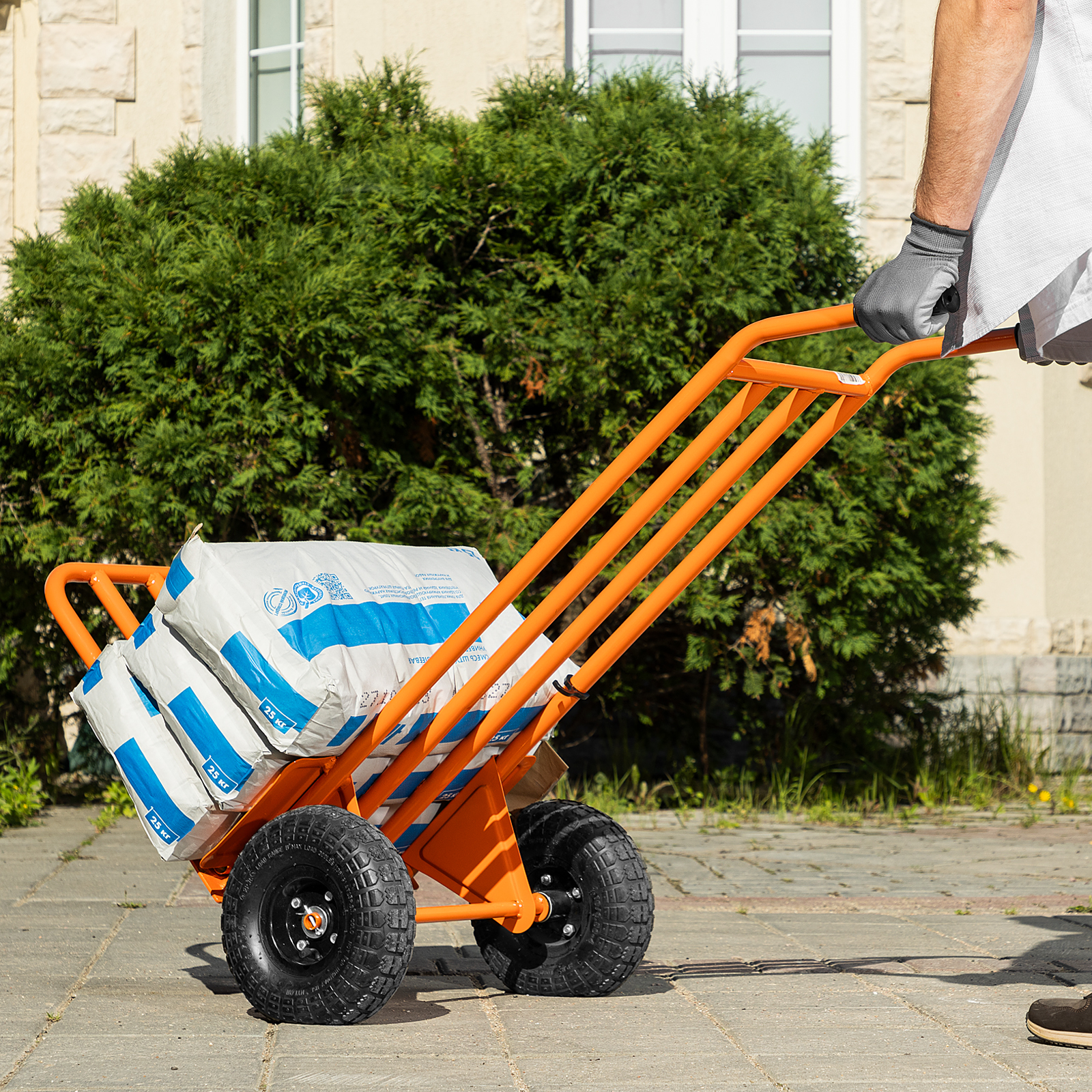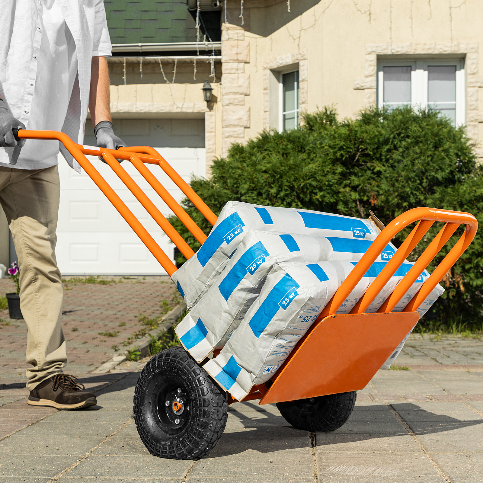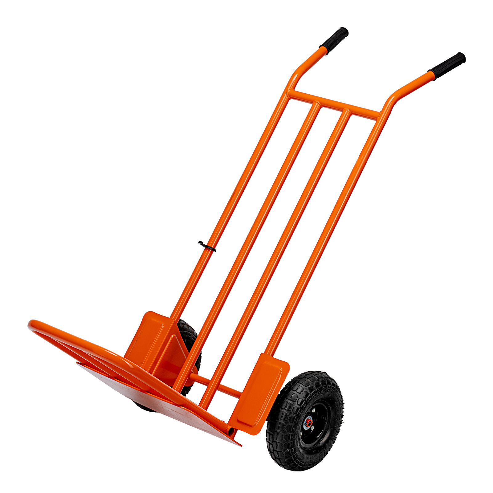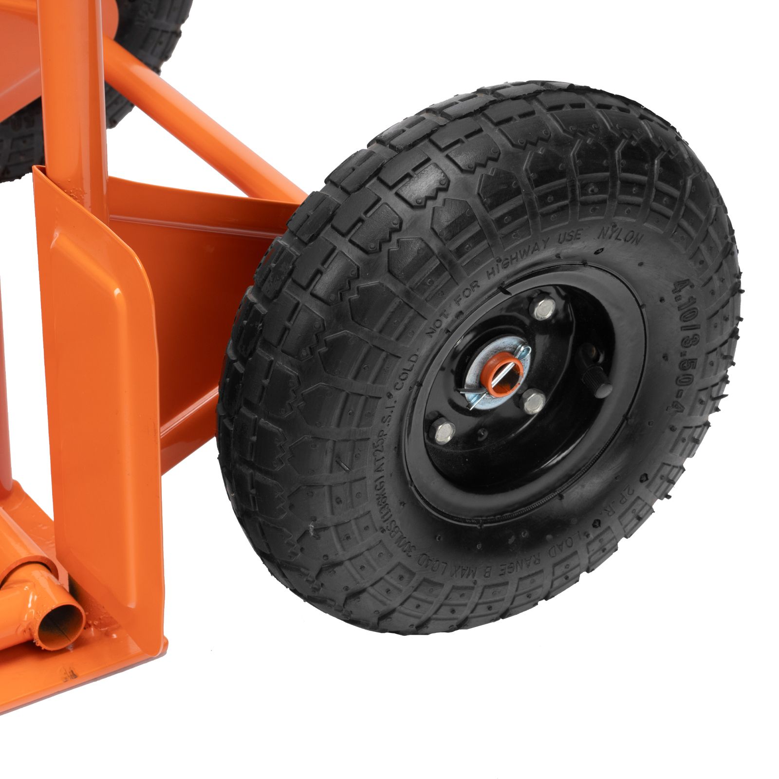 - Удобная транспортировка груза — пневматические колеса с камерами, резиновыми шинами и 2 шарикоподшипниками в каждом гасят вибрации и обеспечивают плавный ход.