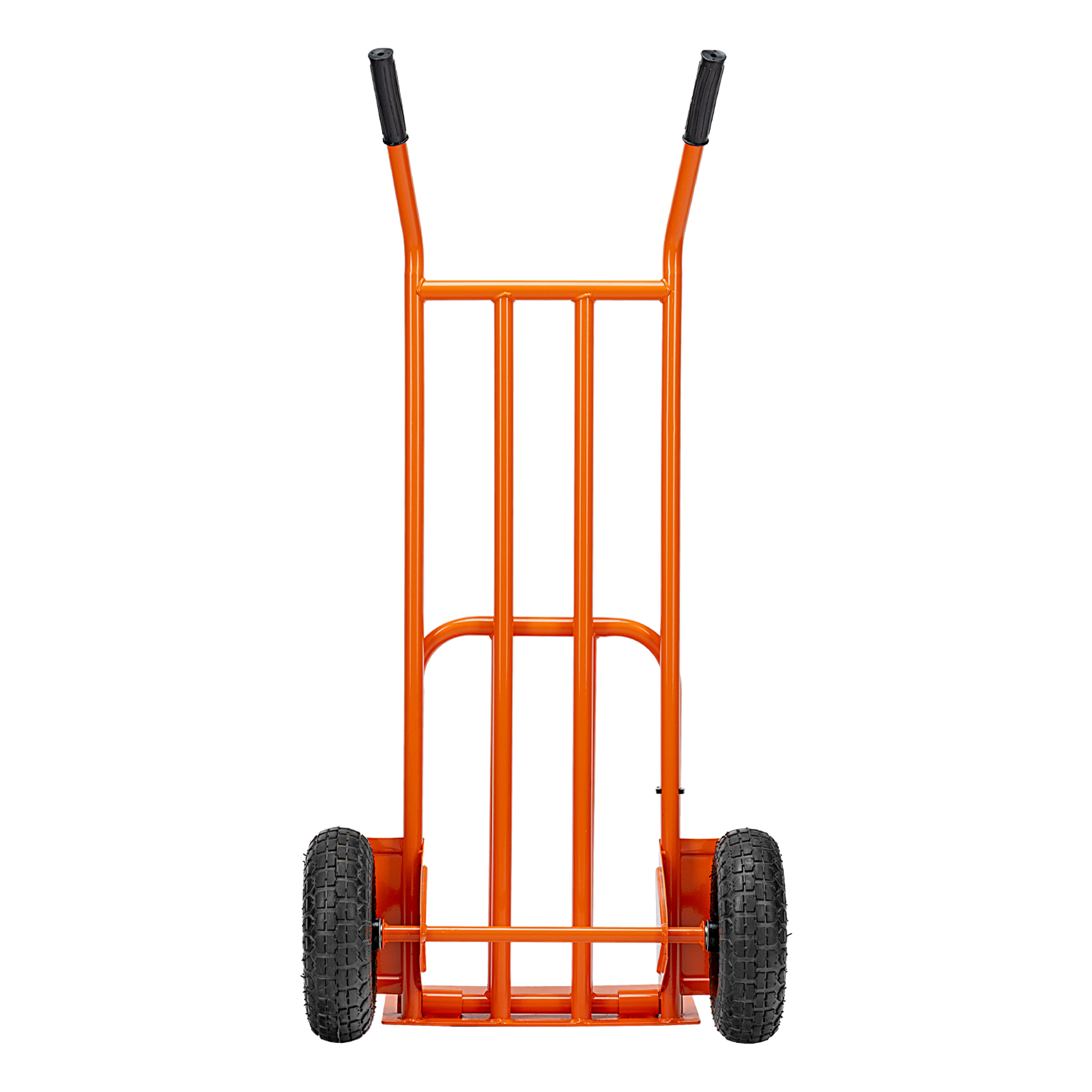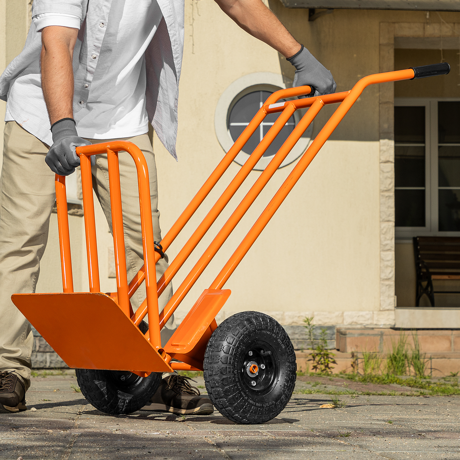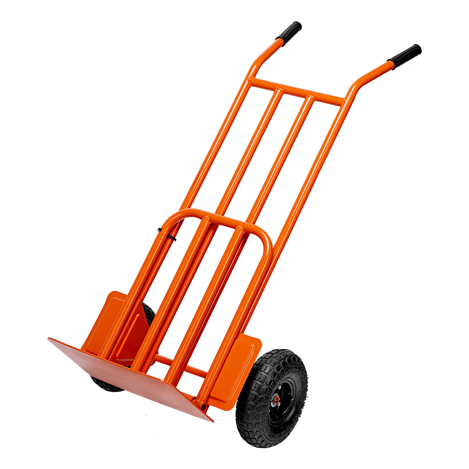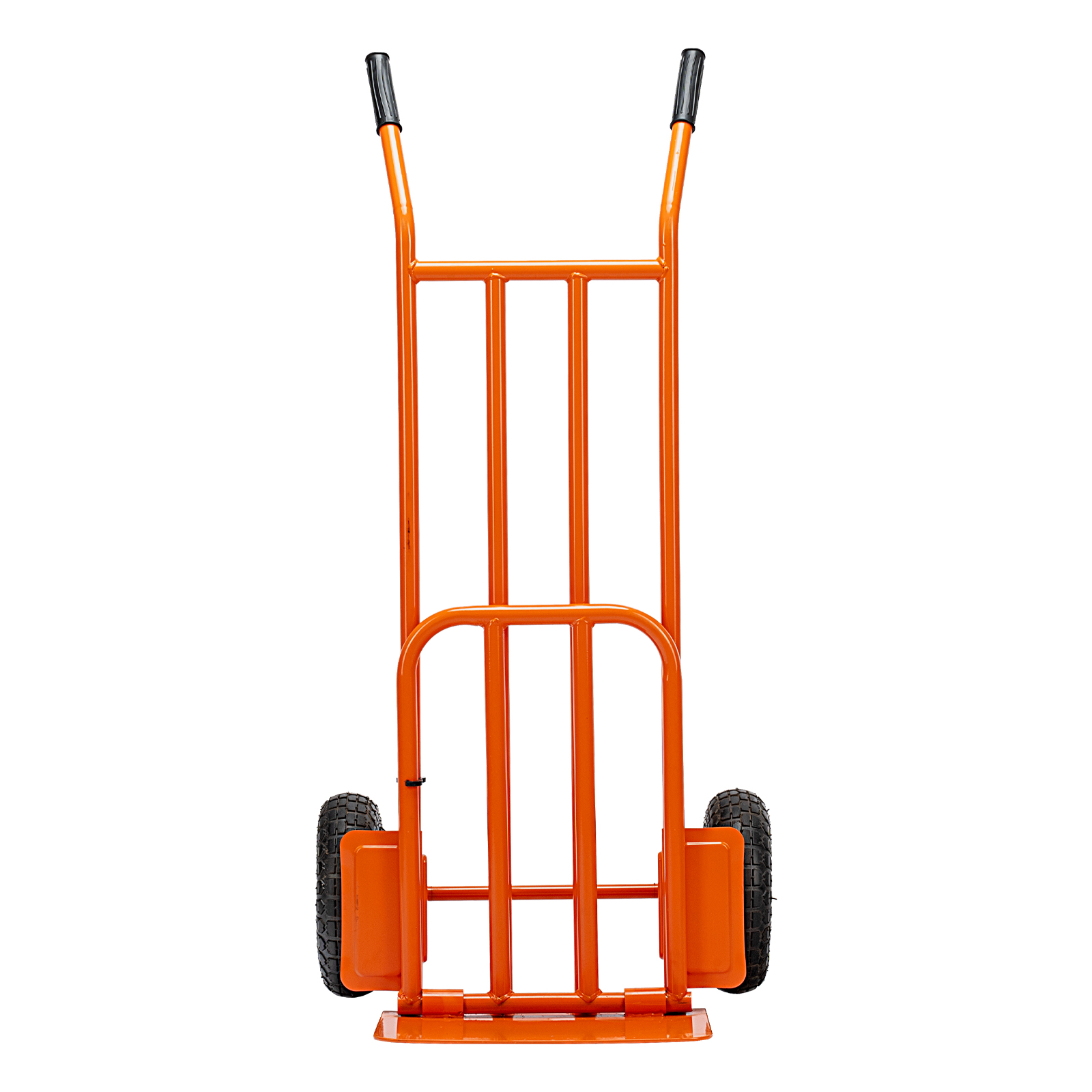- Удобная транспортировка груза — пневматические колеса с камерами, резиновыми шинами и 2 шарикоподшипниками в каждом гасят вибрации и обеспечивают плавный ход.