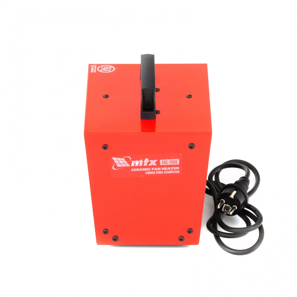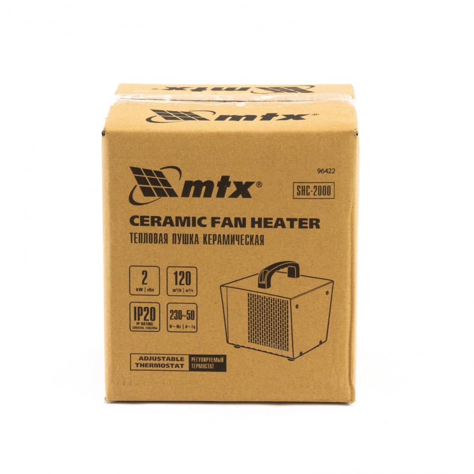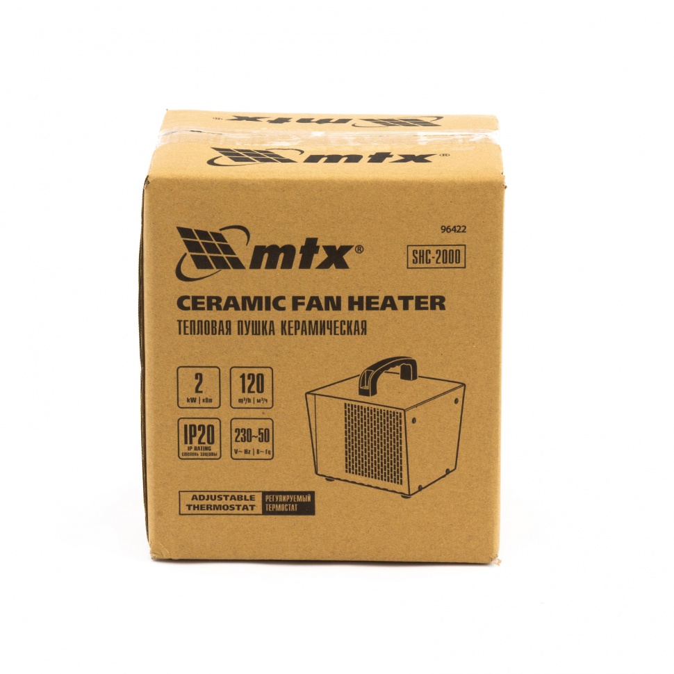 Керамическая тепловая пушка MTX SHC-2000 96422 производительностью 120 куб. м/ч, квадратная, рассчитана на обогрев помещений площадью до 20 кв.м. на мощности 1 или 2 кВт. Работает в режиме теплый воздух / горячий воздух, подходит для использования в гараже, теплице, на складе, в погребе, подвале или ангаре. Также поможет ускорить процесс ремонта в сырую и холодную погоду, ведь ее можно использовать для просушки поверхностей, например, оштукатуренных и окрашенных стен.,В пушке используется керамический нагревательный элемент — он отличается от открытых спиралей нагрева меньшей рабочей температурой и большей площадью, поэтому не сжигает мелкие частицы пыли, не выделяет вредных веществ и не сушит воздух.