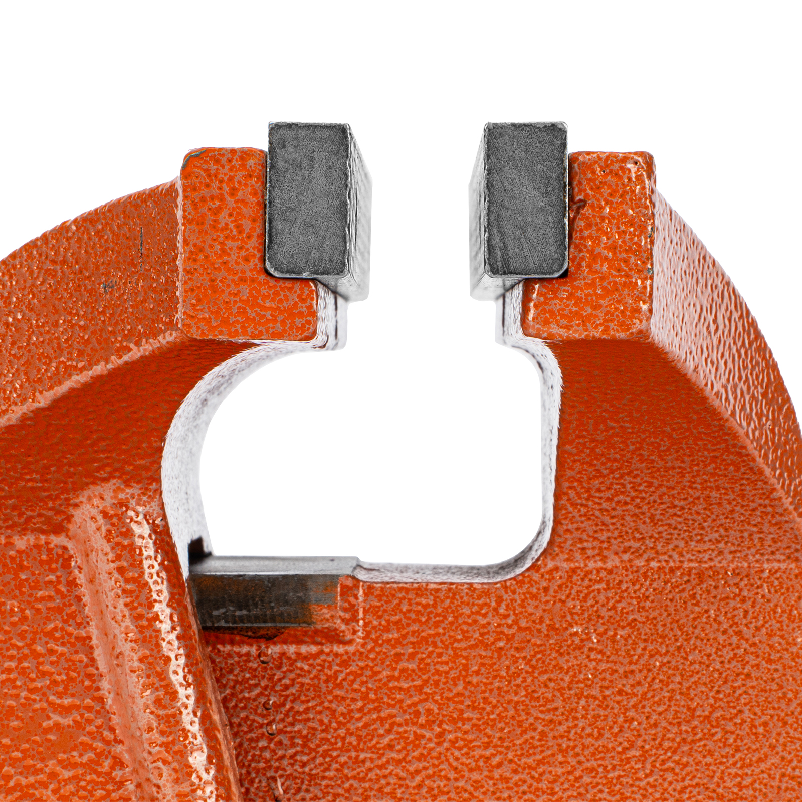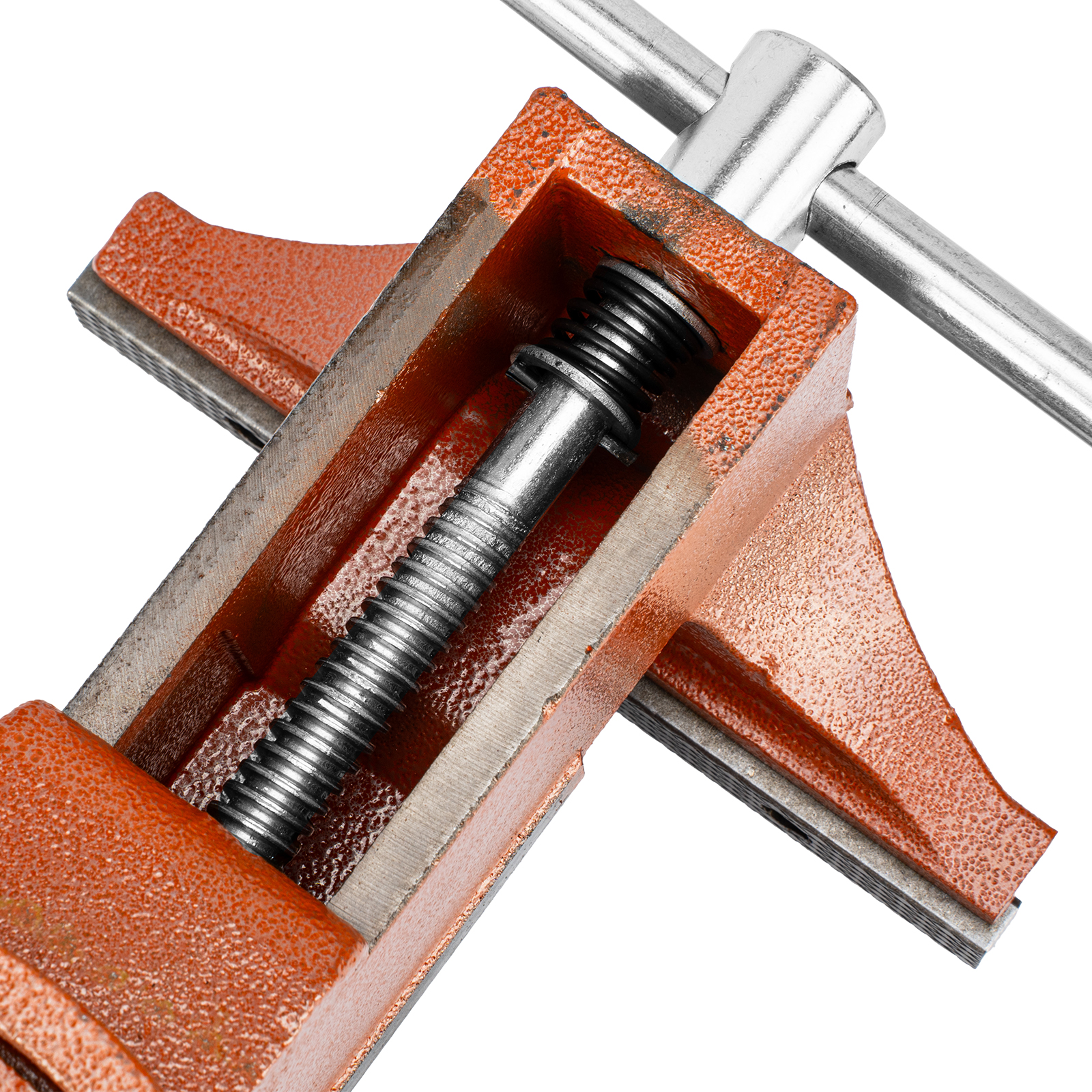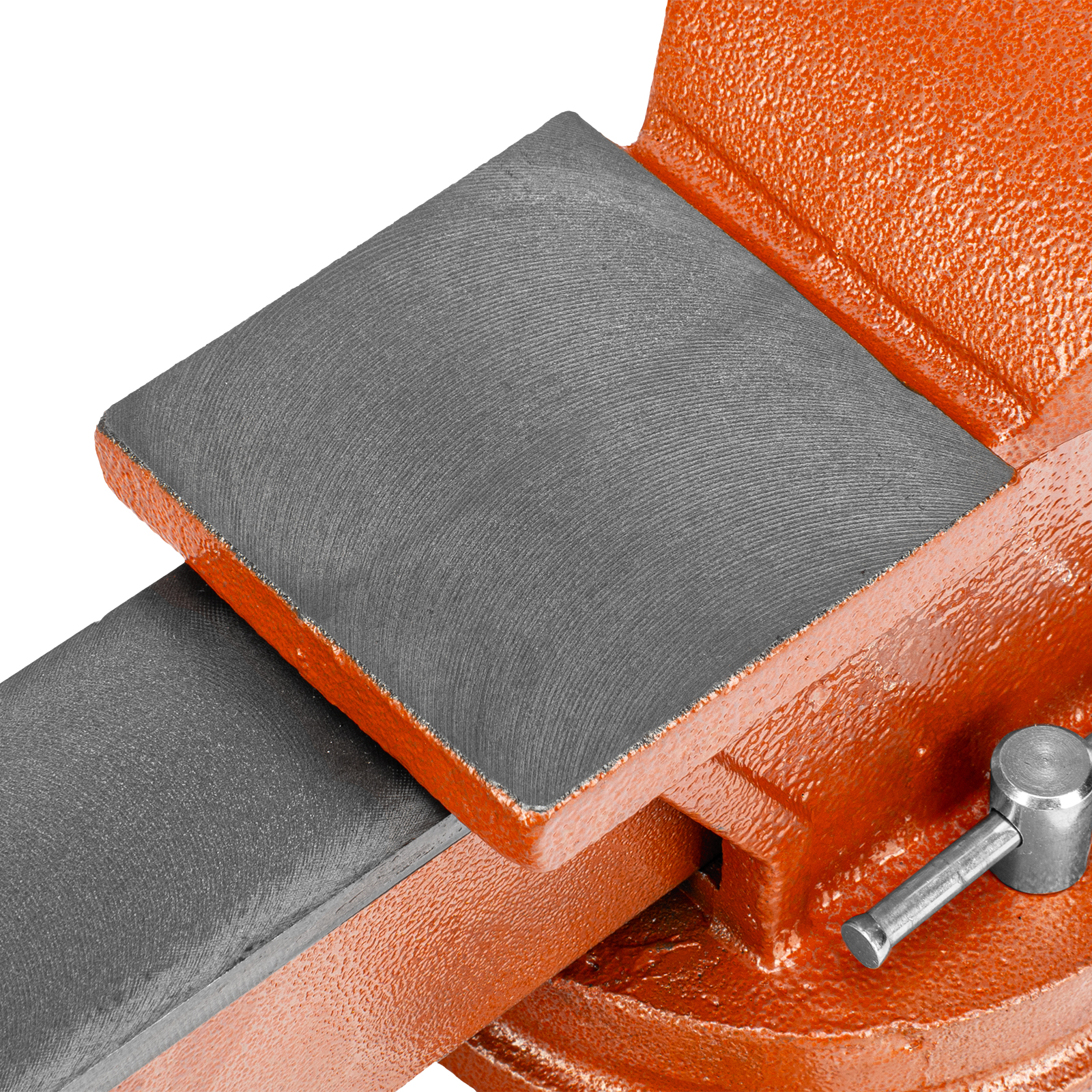 - Корпус тисков выполнен из чугуна, а губки — из стали, благодаря чему достигается высокая прочность инструмента.