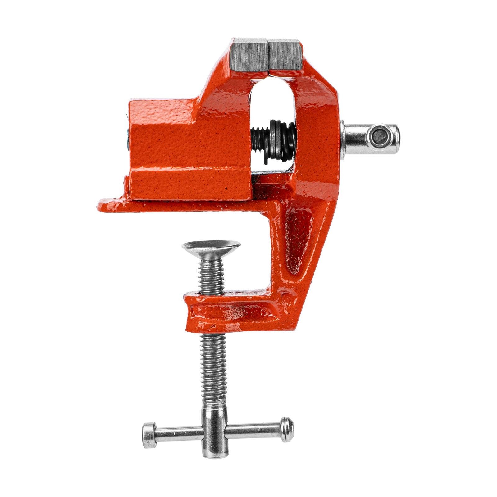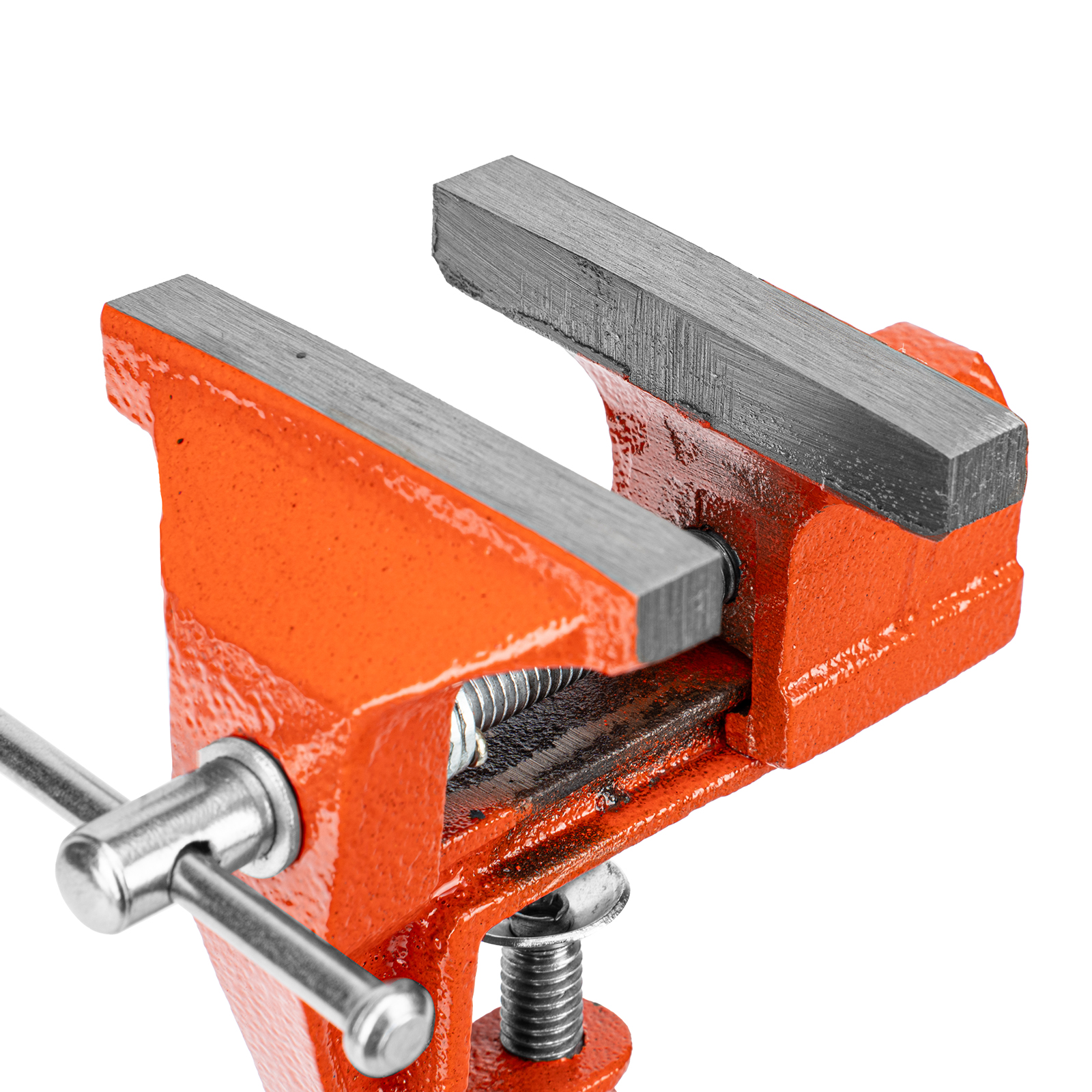 - Простое использование — винтовой зажимной механизм позволяет легко устанавливать и снимать тиски с рабочего стола.
