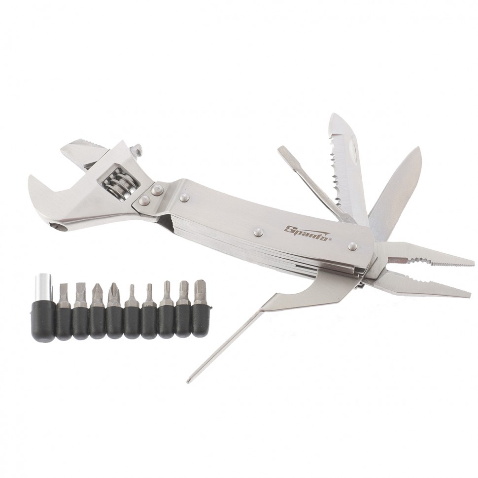 Трансформер Sparta 176065 длиной 170 мм включает в себя 8 предметов и позволяет успешно решать самые разные задачи. Ножом можно разрезать веревку или картон, напильником — заточить рыболовный крючок. Многофункциональный набор включает также разводной ключ, пассатижи и биты, необходимые для выполнения слесарных работ. Его можно использовать дома, на даче, в гараже, а также в походе, на охоте или рыбалке.