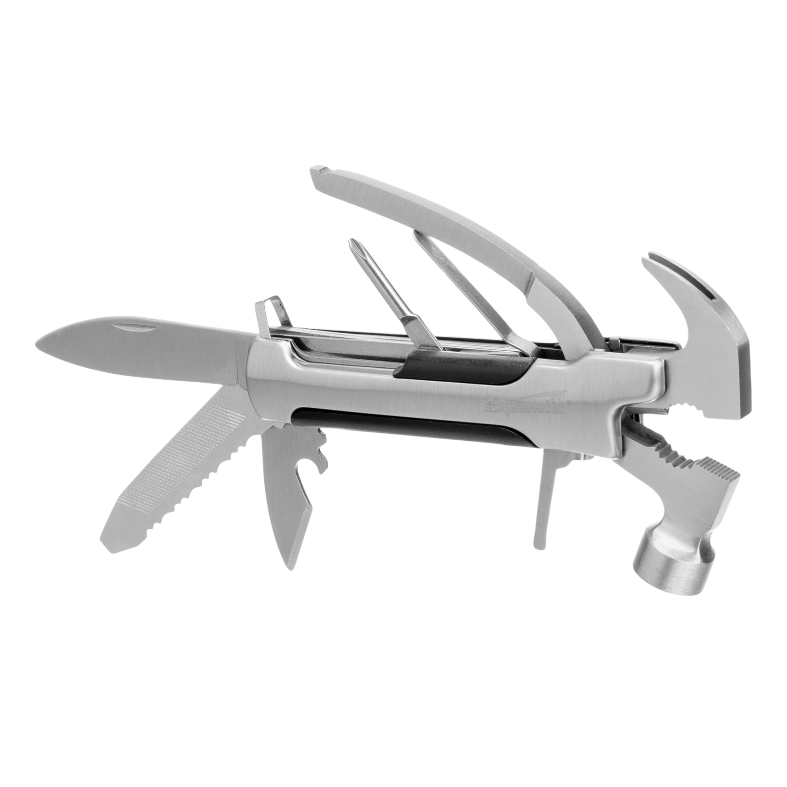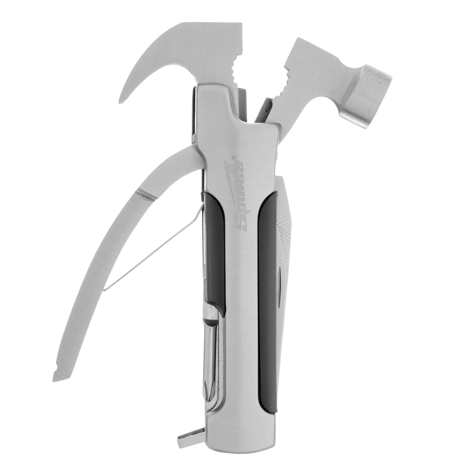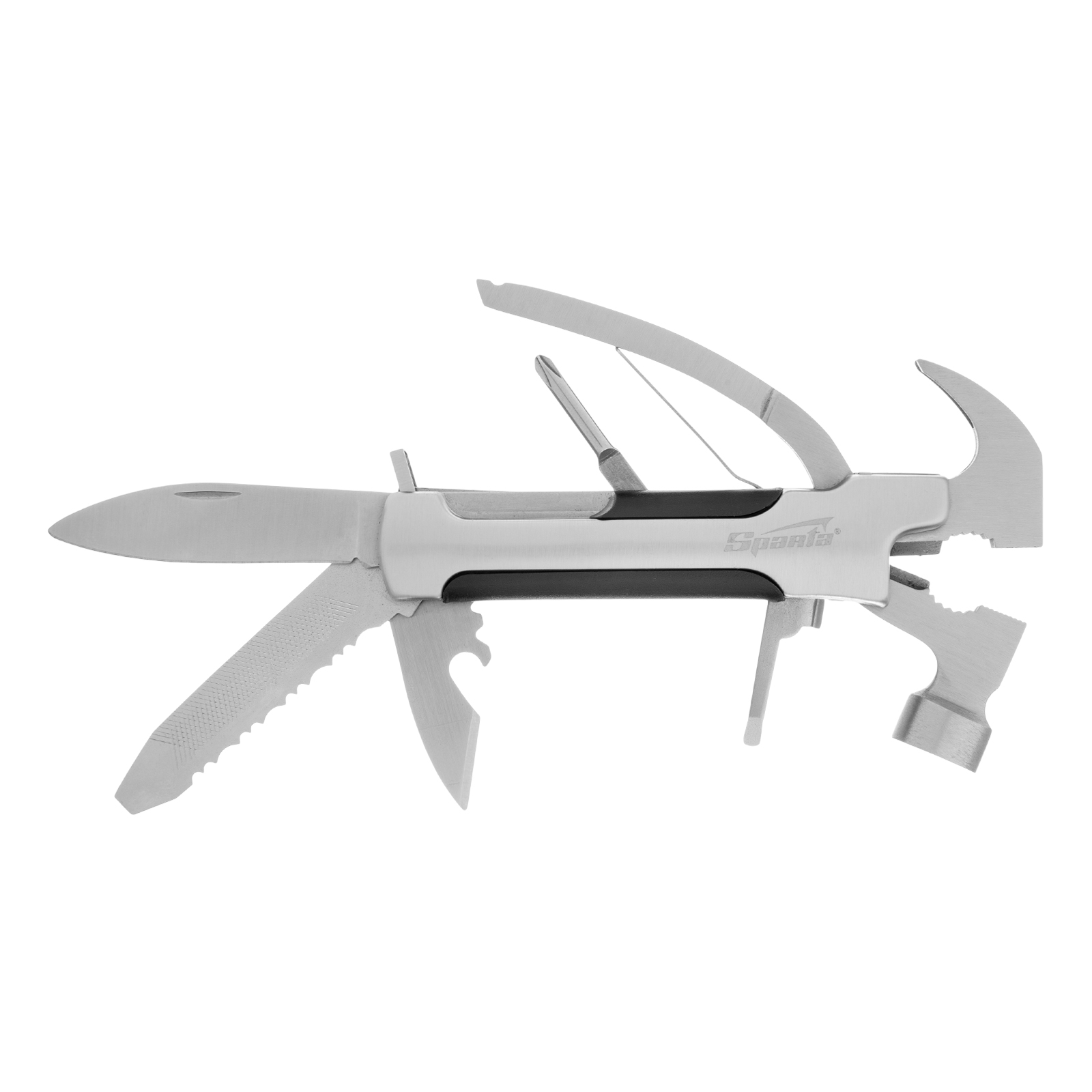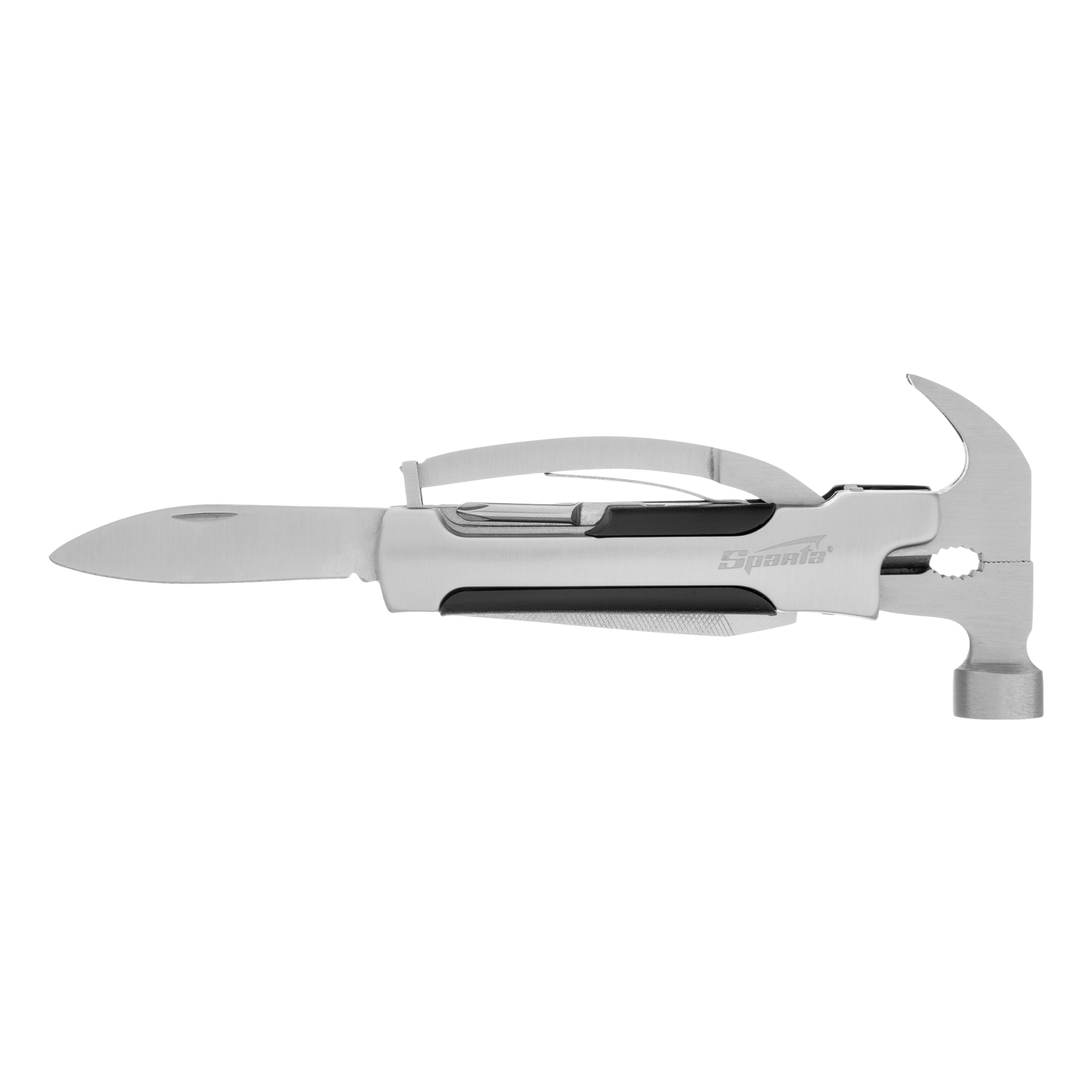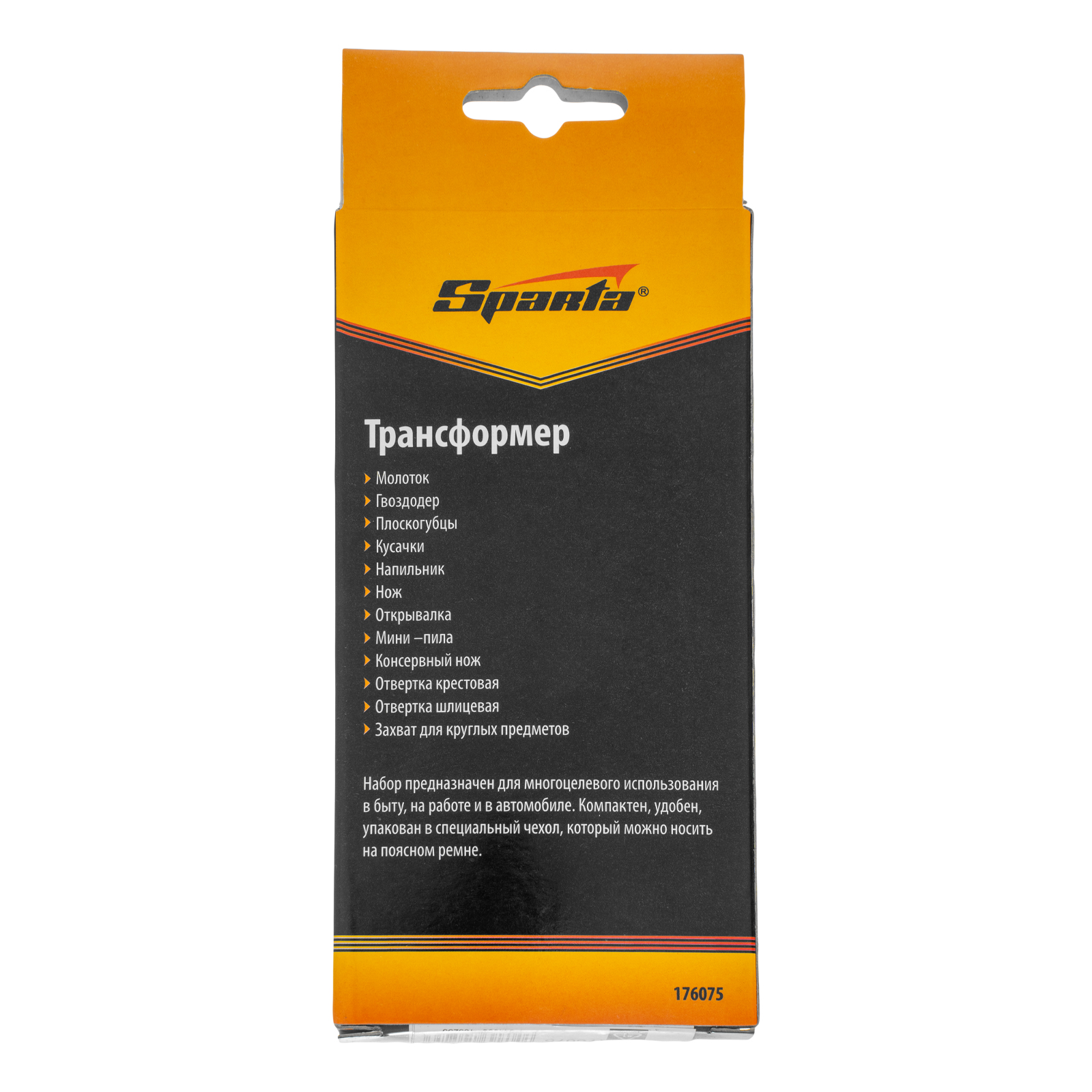 Трансформер Sparta 176075 выполняет 12 функций и включает в себя предметы, необходимые дома, на даче, рыбалке или охоте, а также в походе или поездке. Ножом можно разрезать веревку или вскрыть упаковку, а консервным ножом-открывалкой — открыть банку или бутылку. Молоток-гвоздодер пригодится для забивания и выпрямления гвоздей, а отвертки — для работы с резьбовым крепежом.