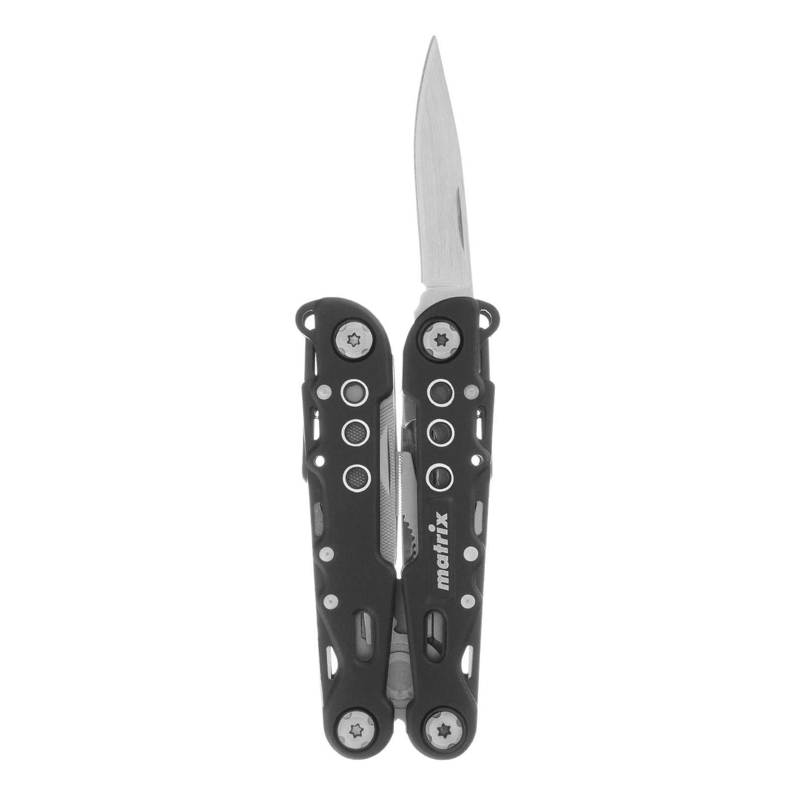 Трансформер Matrix 17622 — это мультитул длиной 165 мм с 13 функциями и авторазжимом, поставляется с чехлом. Его можно использовать в гараже — он включает длинногубцы с кусачками и захватом полукруглых предметов, а также отвертки. Инструмент пригодится в походе, на рыбалке или охоте, поскольку имеет в составе нож, пилу, открывалку и консервный нож. Благодаря пилке для ногтей мультитул будет полезен в быту.