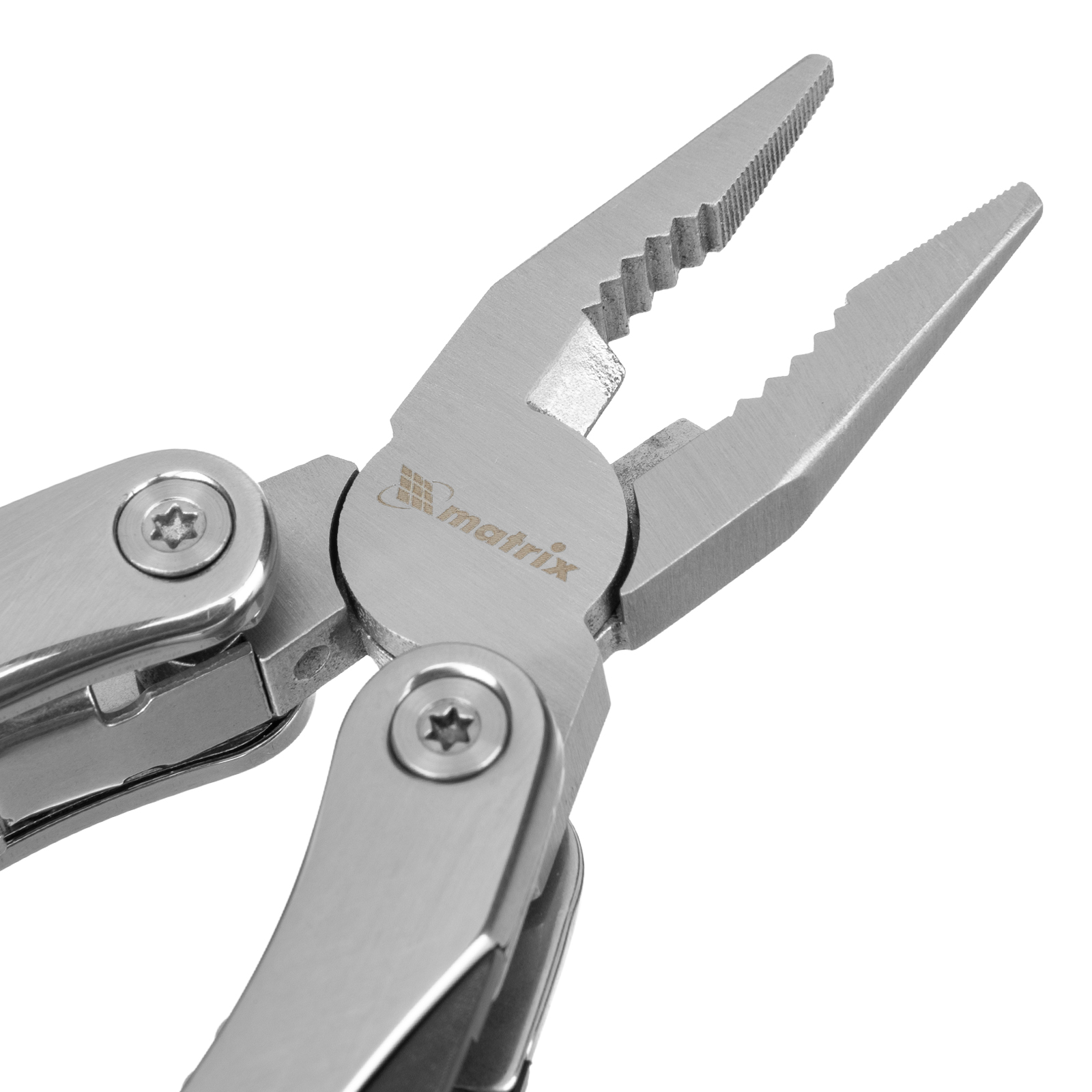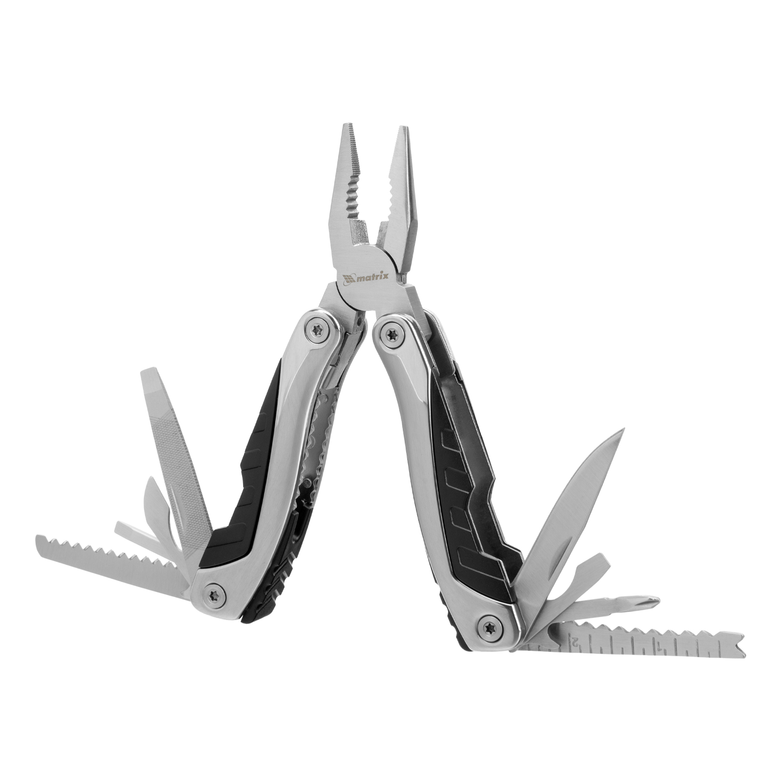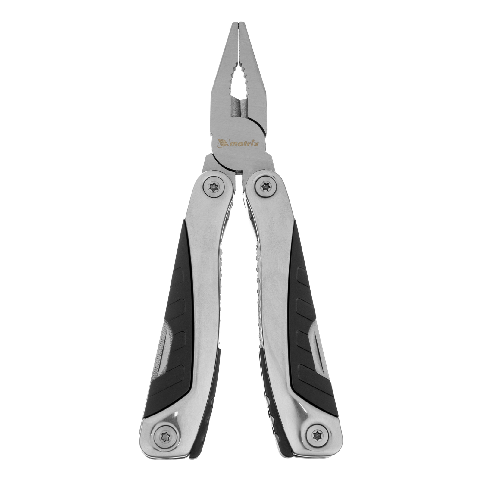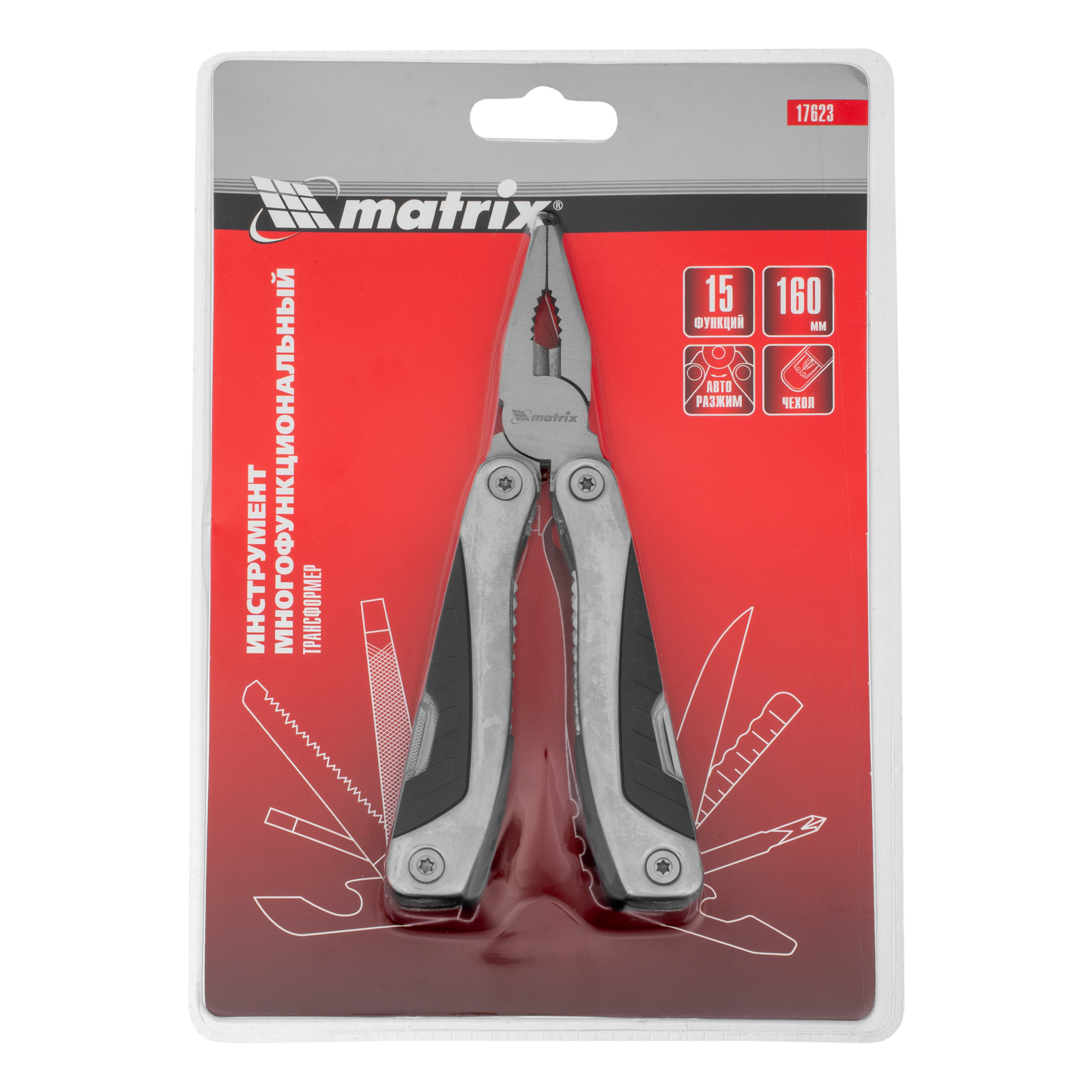 Трансформер Matrix 17623 длиной 160 мм имеет 15 функций и авторазжим, поставляется с чехлом. Может использоваться в гараже, т.к. включает длинногубцы с кусачками и захватом полукруглых предметов, а также отвертки и линейку. Трансформер пригодится в походе, на рыбалке или охоте, поскольку имеет в составе нож, пилу, открывалку, консервный нож, инструменты для чистки рыбы и удаления крючка. Благодаря пилке для ногтей мультитул будет полезен в быту.