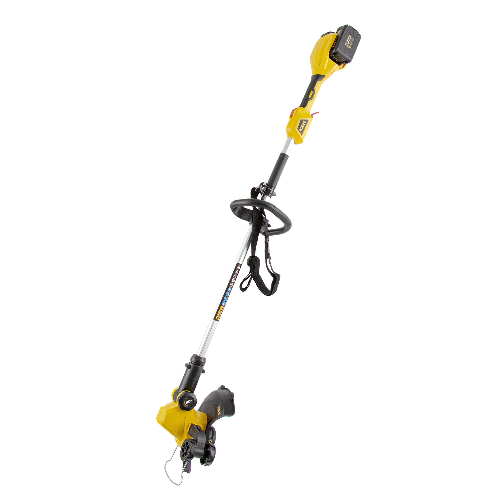 Триммер аккумуляторный Denzel RT300-36 58710 работает от батареи Li-Ion напряжением 36 В и емкостью 4 А·ч, обеспечивая ширину скашивания 300 мм. Предназначен для скашивания свежей травы, обработки границ газона, удаления растительности на небольших приусадебных участках. Выполняет поставленные задачи с помощью лески, совмещая функции триммера и кромкореза. Поворотная голова с расположенным в ней электродвигателем обеспечивает комфортную эксплуатацию в самых труднодоступных местах.,Триммер не требует использования топлива и подключения к сети электроснабжения. Он комплектуется двумя аккумуляторными батареями увеличенной емкости с интеллектуальной системой распознавания типа нагрузки.
