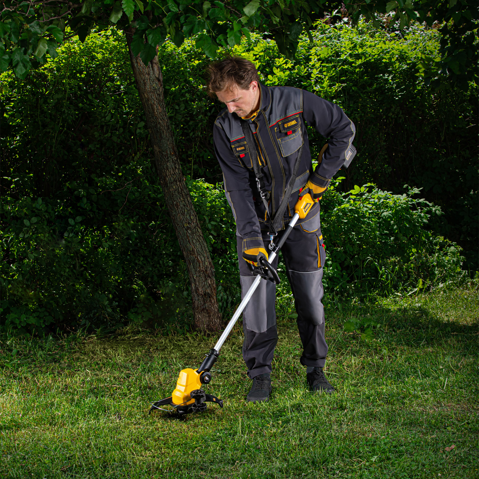 - Равномерное распределение нагрузки — к триммеру прилагается плечевой ремень, позволяющий скашивать траву без ощущения усталости.