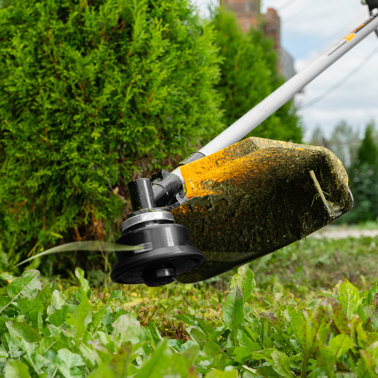 - Автоматическая подрезка лески — нож на кожухе укорачивает концы корда до нужной длины, что предотвращает перегрузку двигателя.