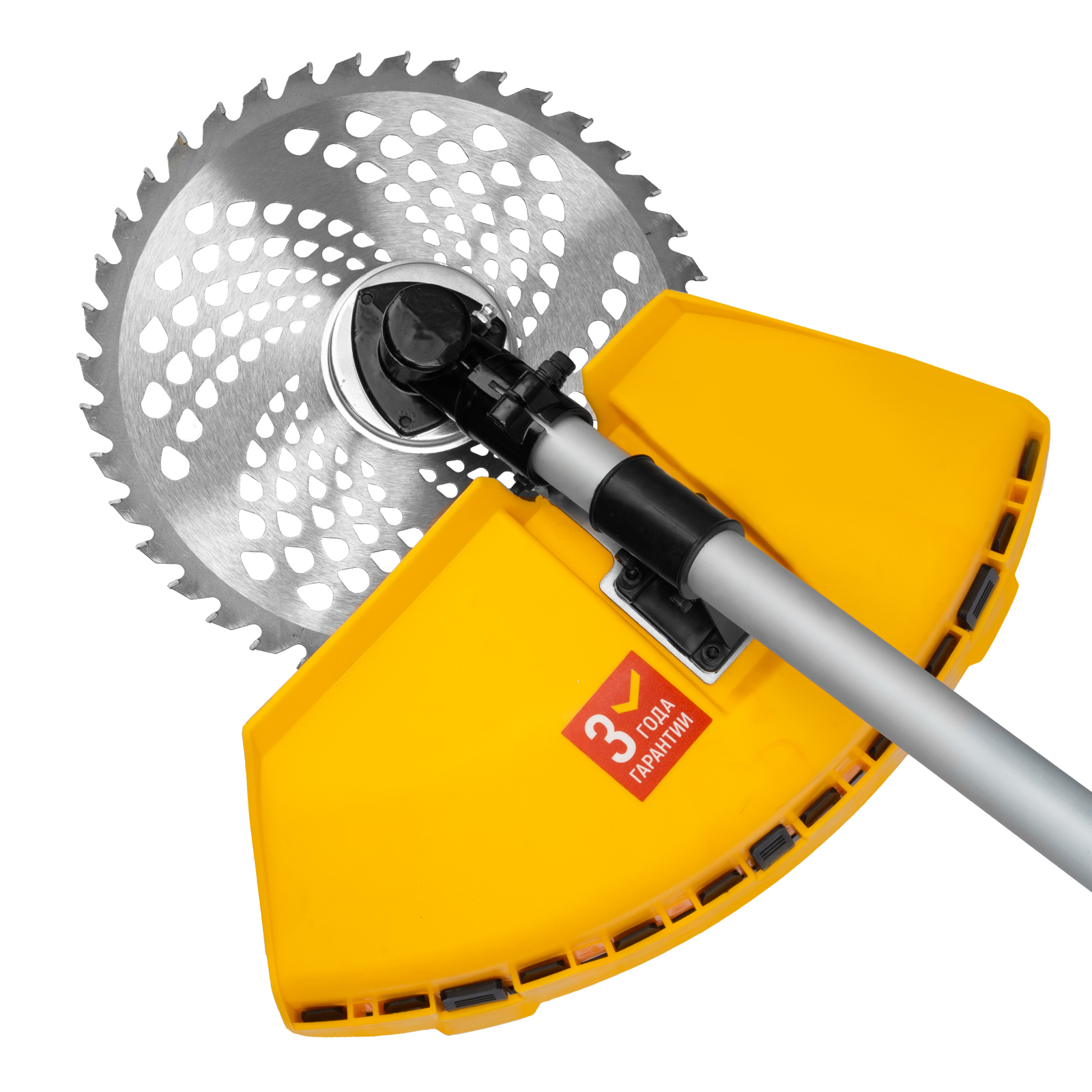 - Дополнительные возможности — можно приобрести и установить на триммер диски Denzel 96323, 96325 для быстрого удаления растительности с жесткими стеблями (полыни, крапивы, лебеды), 96328 для скашивания молодых побегов кустарника диаметром до 3 мм.