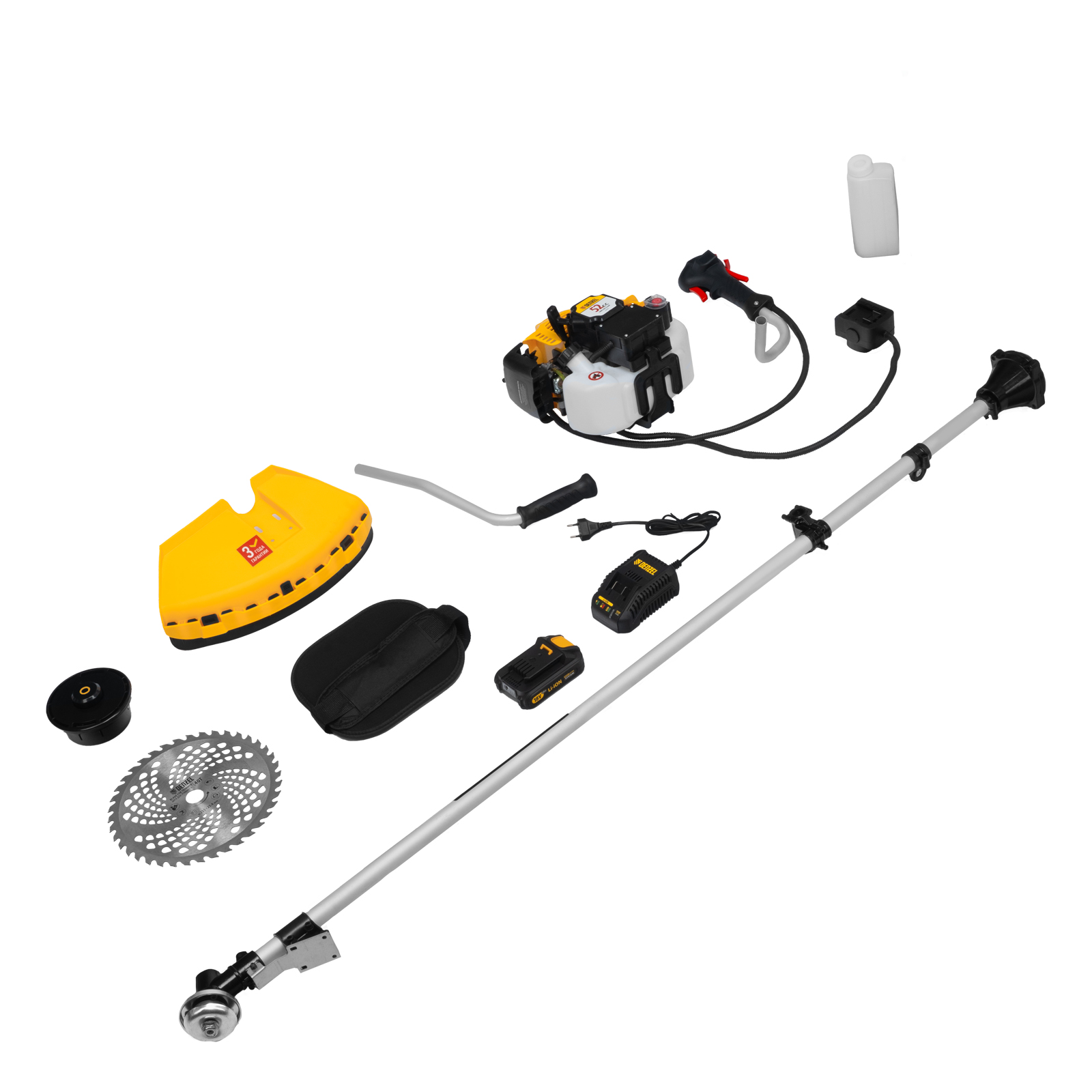 Двигатель с правой рукояткой - 1 шт, левая рукоятка - 1 штШтанга (в сборе с редуктором и корпусом сцепления) - 1 штЗащитный кожух с ножом - 1 штКатушка с леской - 1 шт, пильный диск 40Т - 1 штДозатор для приготовления смеси - 1 штРемень плечевой с защитой бедра - 1 штУзел крепления рукояток с крепежом - 1 штСвечной ключ - 1 штШестигранник H5 - 1 шт, шестигранник H6 - 1 штБолт M6×20 - 4 шт, болт M5×15 - 4 шт, гайка M5 - 4 штАккумулятор - 1 шт, зарядное устройство для аккумулятора - 1 штРуководство по эксплуатации с гарантийным талоном - 1 шт |