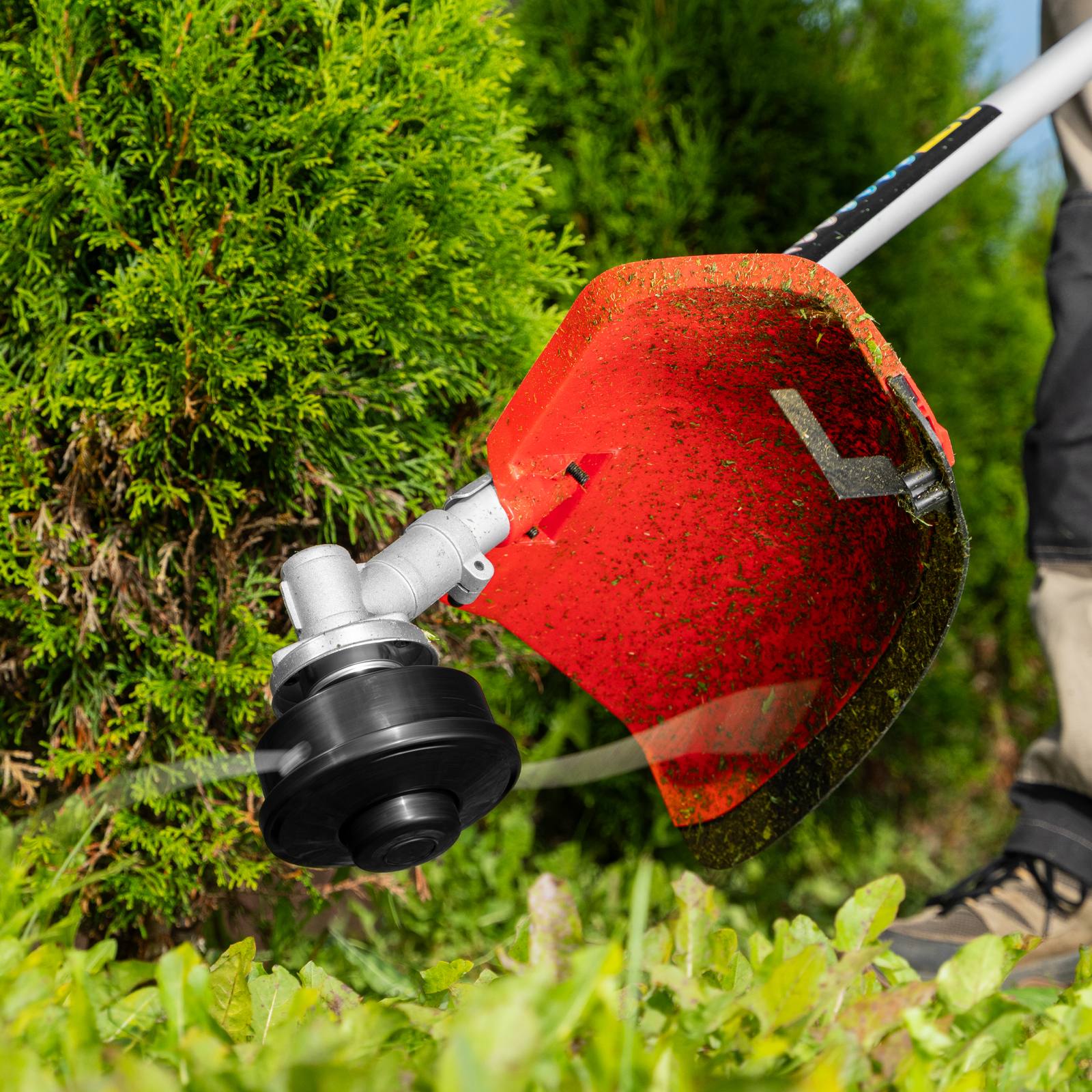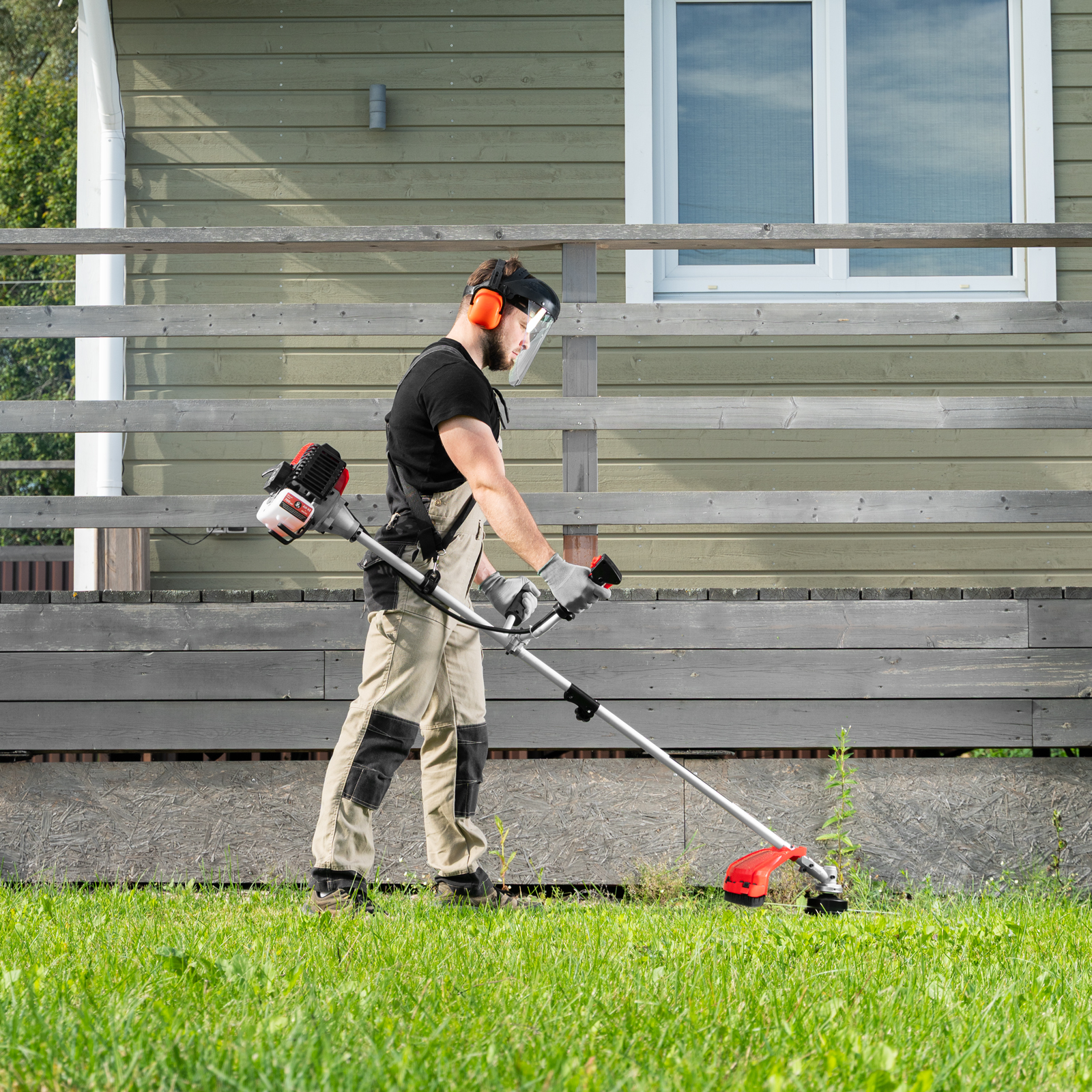 Бензиновый триммер MTX MT-33S 962325 с разъемной штангой и двигателем объемом 33 см3 предназначен для стрижки и скашивания травы, формирования границ газонов. Удобен для обработки участков вдоль стен и оград, вокруг деревьев. В качестве режущих элементов используются катушка с леской диаметром 3 мм и трехлопастный нож, благодаря которым триммером можно скашивать даже густую траву и сорняки с толстыми стеблями. Ширина скашивания леской составляет 420 мм, ножом — 255 мм, что позволяет эффективно справляться с работой. Триммер незаменим для ухода за дачным участком.