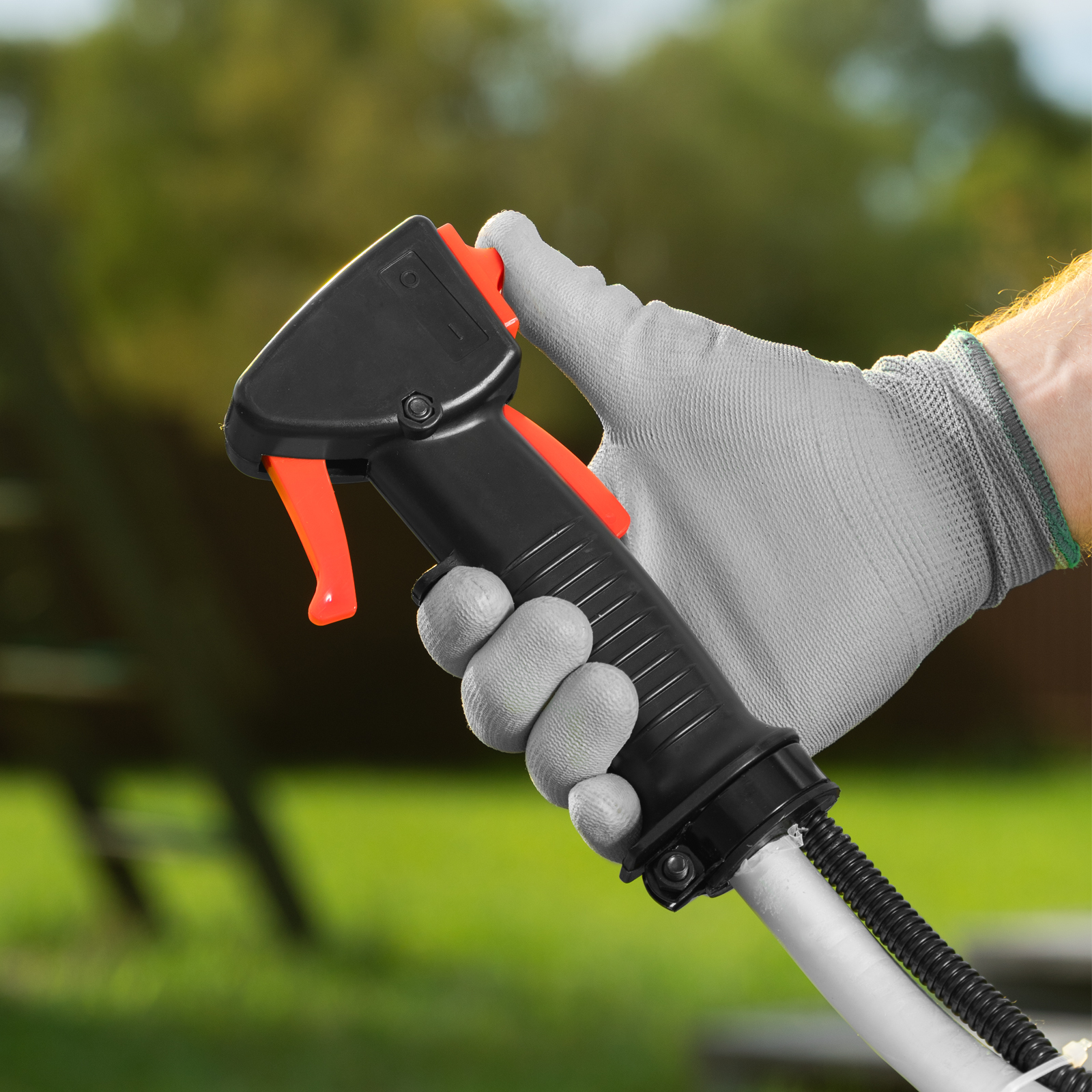 - Комфортная работа — благодаря плечевому ремню и рукояткам велосипедного типа триммер удобно удерживать и направлять.