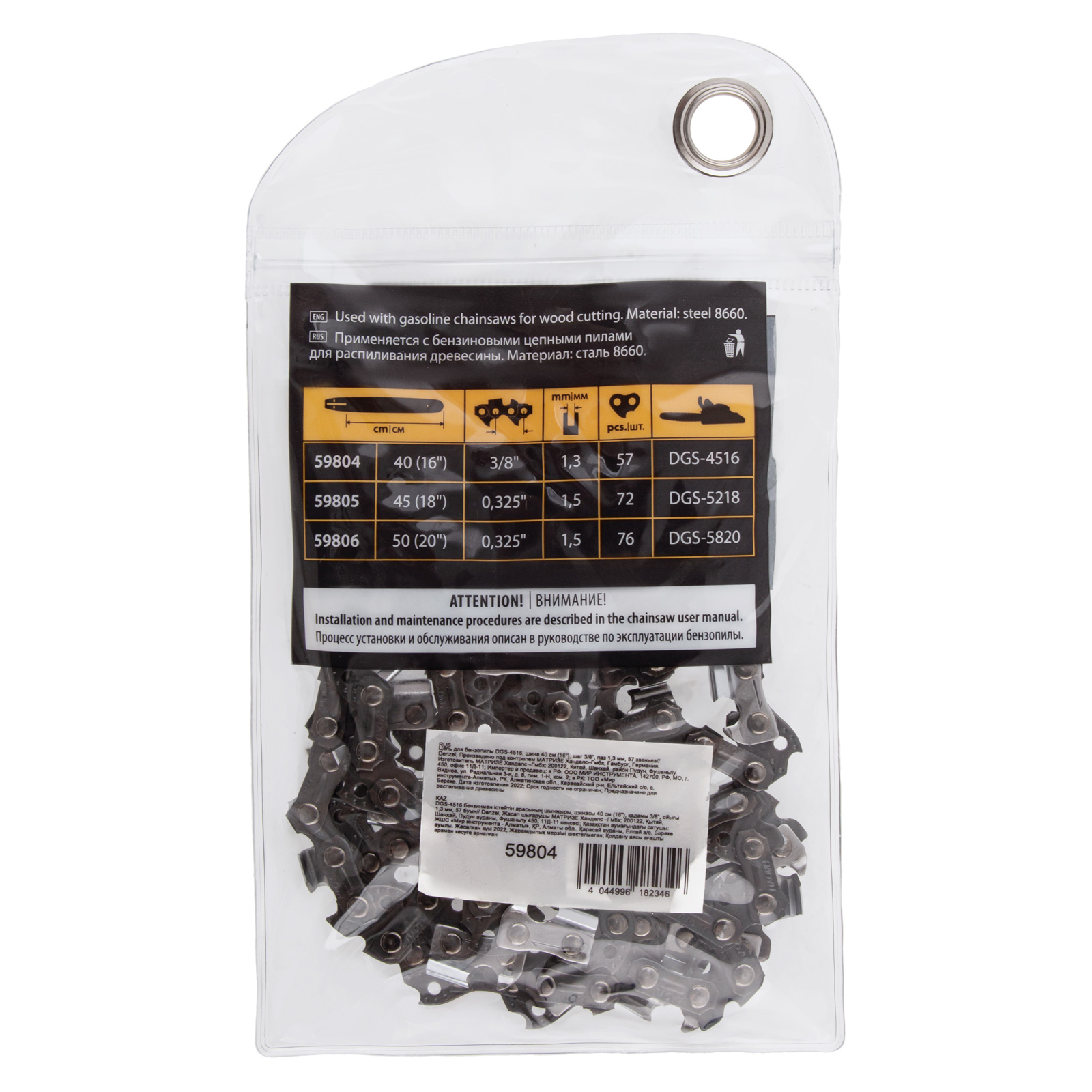 - Безопасное хранение и транспортировка — защитная упаковка предотвращает контакт с острыми звеньями.