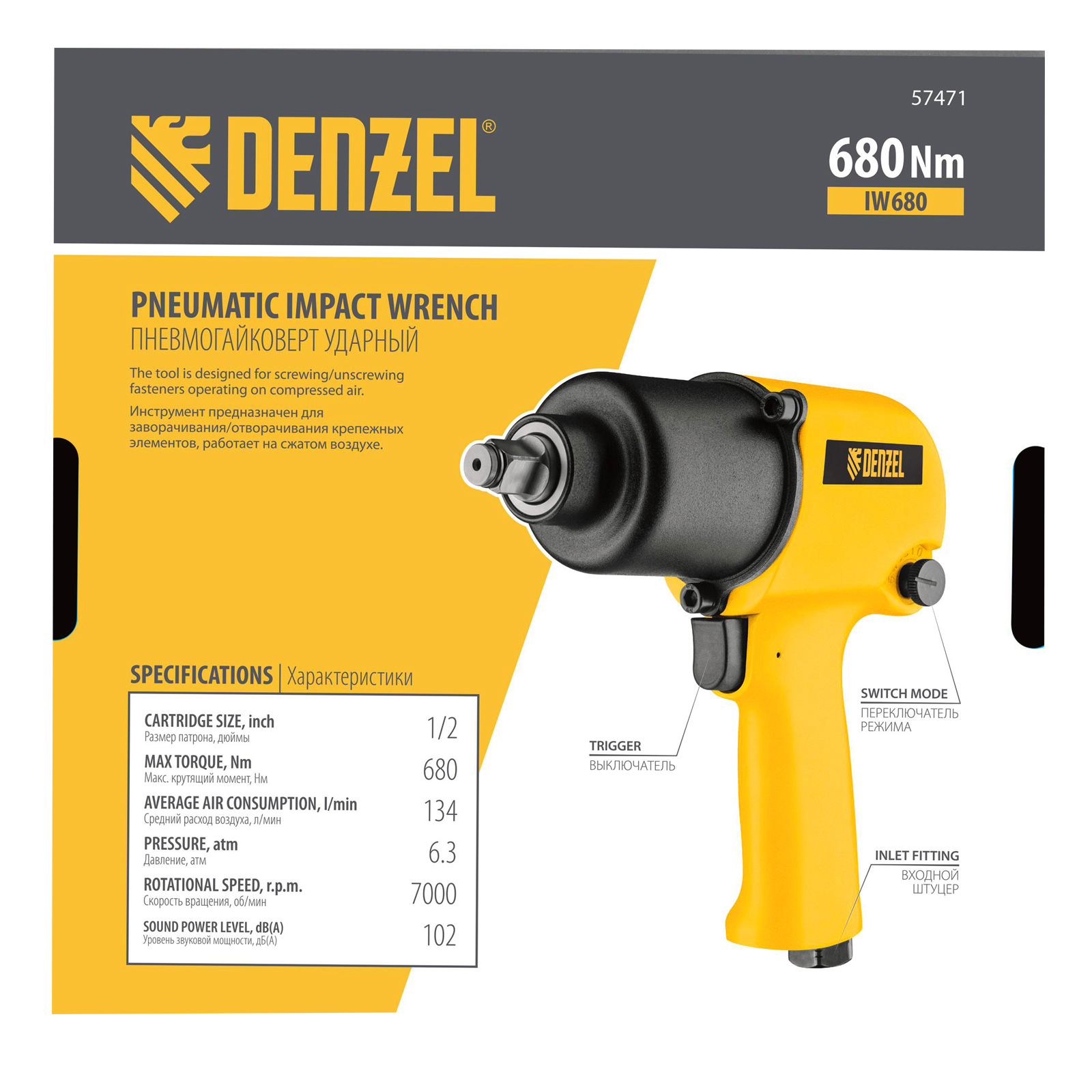 Ударный пневмогайковерт Denzel IW680 57471 с присоединительным квадратом 1/2″, максимальной скоростью вращения 7000 об/мин и крутящим моментом 680 Нм быстро справляется с закручиванием и откручиванием резьбовых крепежей, в том числе и с высоконагруженными соединениями. Крутящего момента достаточно для выполнения профессиональных задач в сборочном и сварочном цехах, на строительной площадке или в сервисе шиномонтажа. Гайковерт имеет 10 ступеней регулировки, что позволяет установить оптимальный режим работы в зависимости от типа крепежа и материала.