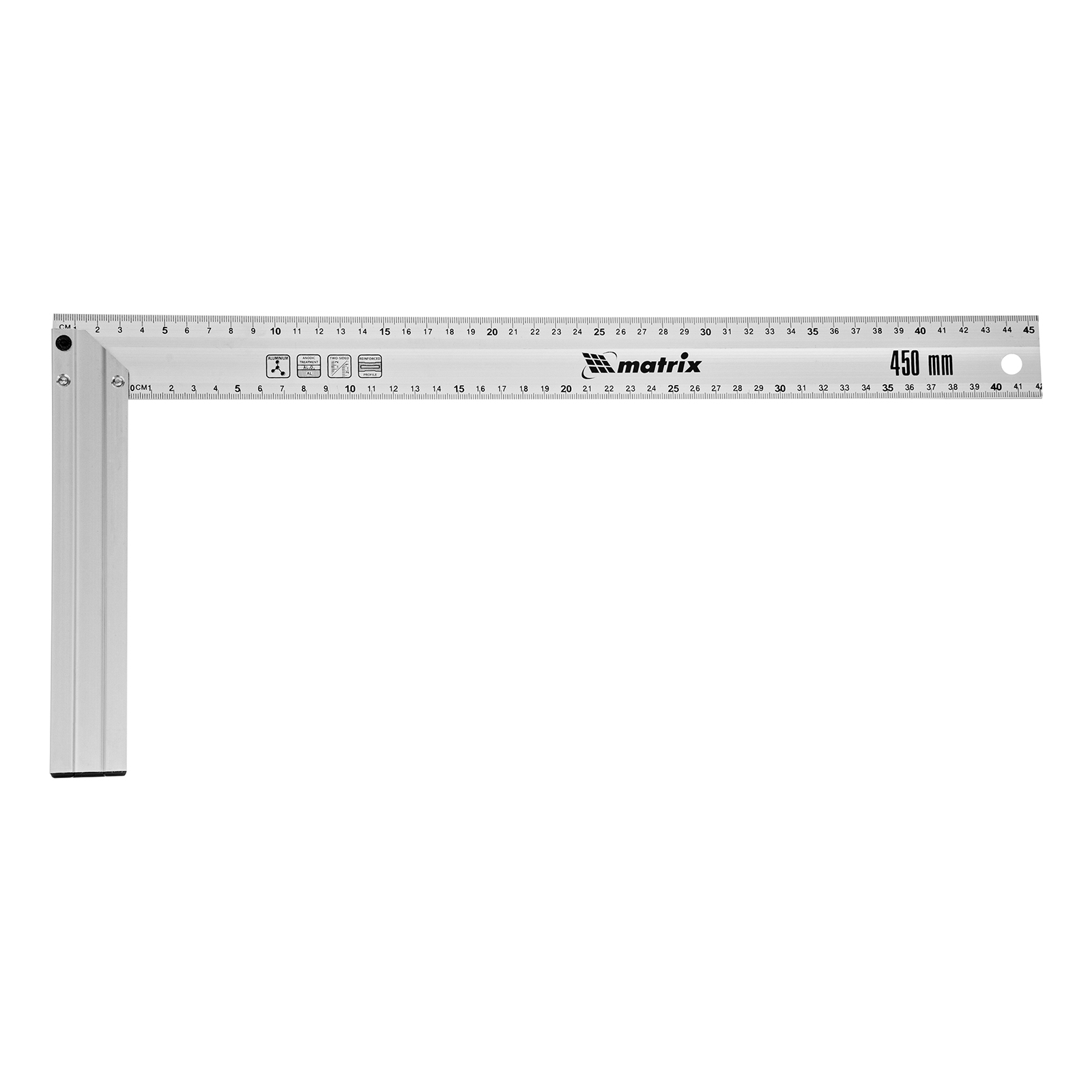 Алюминиевый литой угольник Matrix 32475 длиной 450 мм используется для проверки и разметки прямых углов во время столярных и отделочных работ. Простой, но незаменимый инструмент повышает точность работы и позволяет получить качественный результат.