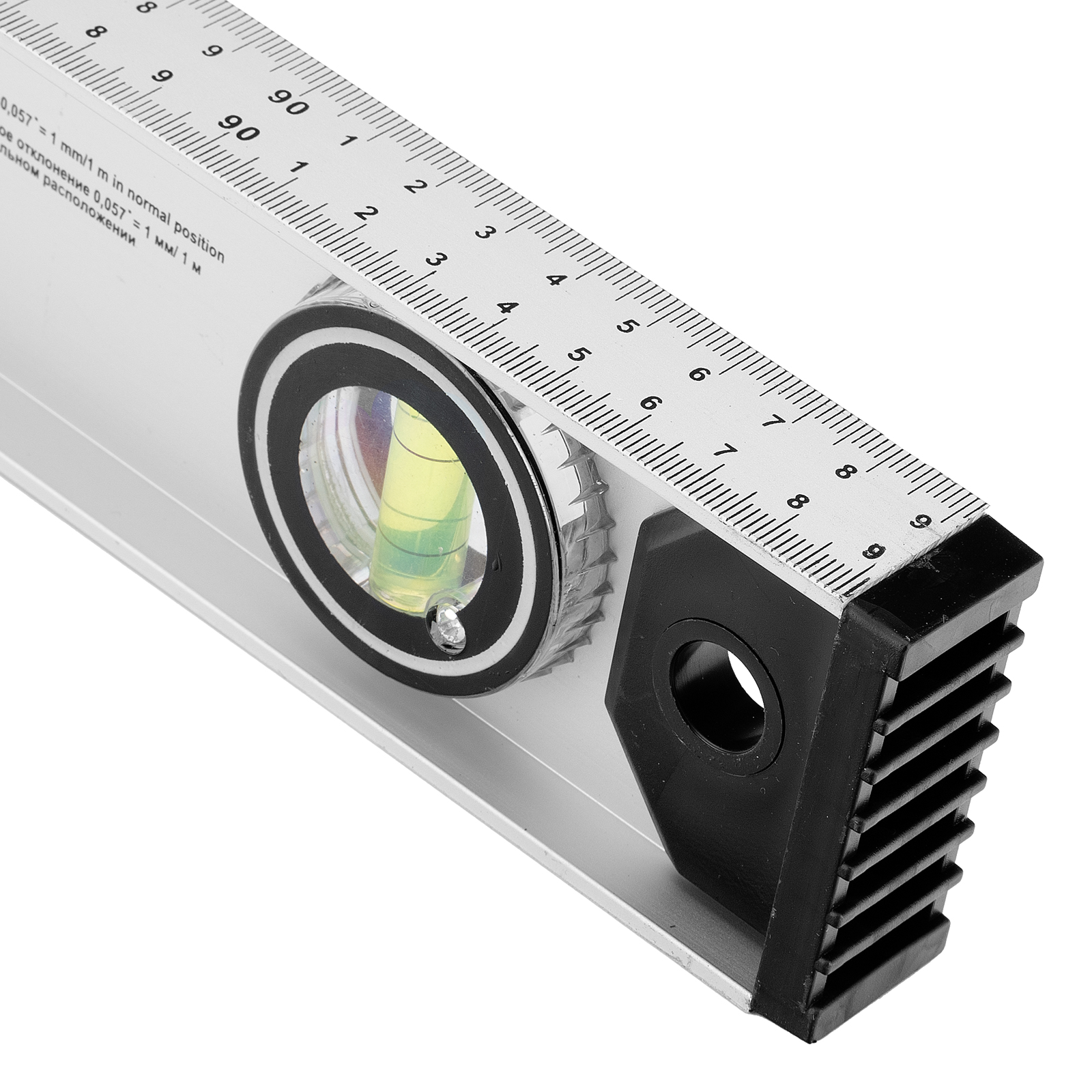 Алюминиевый уровень Matrix «Рельс» 34029 длиной 1000 мм имеет 3 глазка: 2 для проверки отклонений от заданной вертикали и горизонтали и 1 поворотный для проверки наклонных поверхностей.