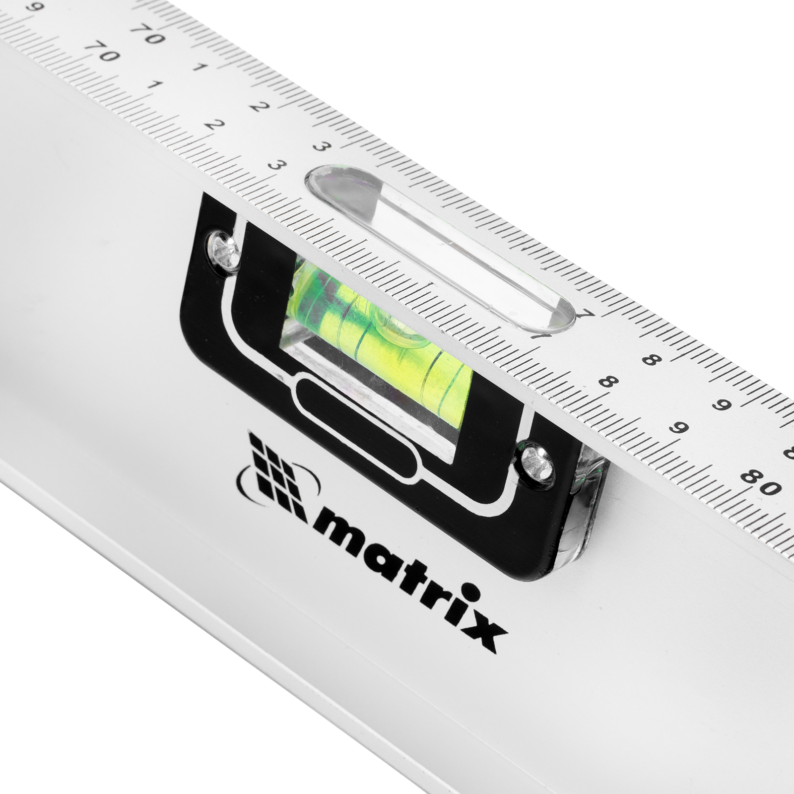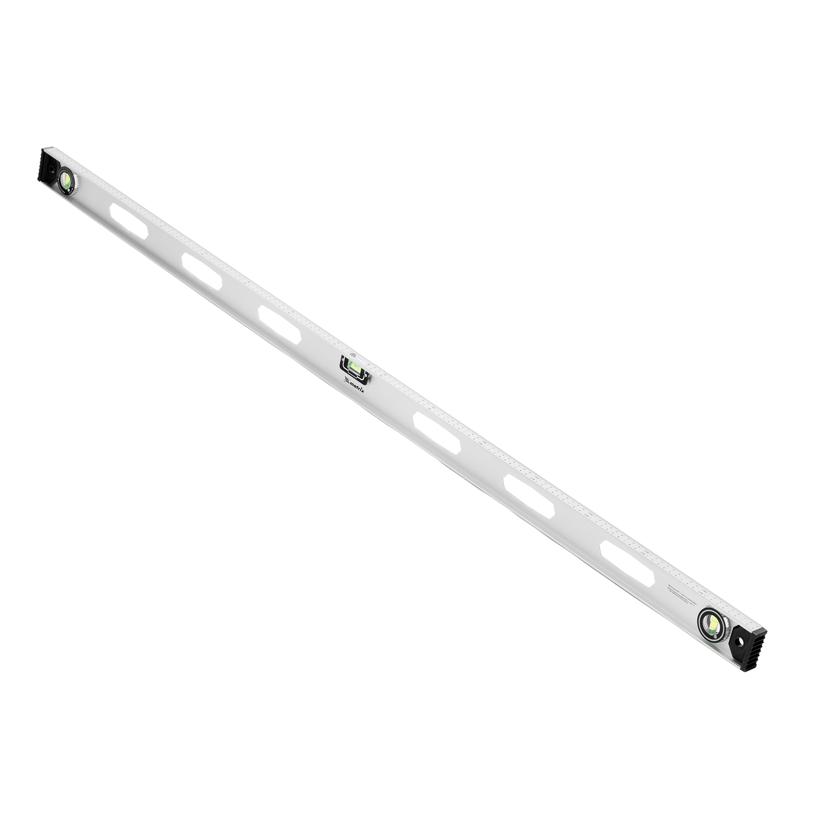 Алюминиевый уровень Matrix «Рельс» 34035 длиной 1500 мм имеет 3 глазка: 2 для проверки отклонений от заданной вертикали и горизонтали и 1 поворотный для проверки наклонных поверхностей.