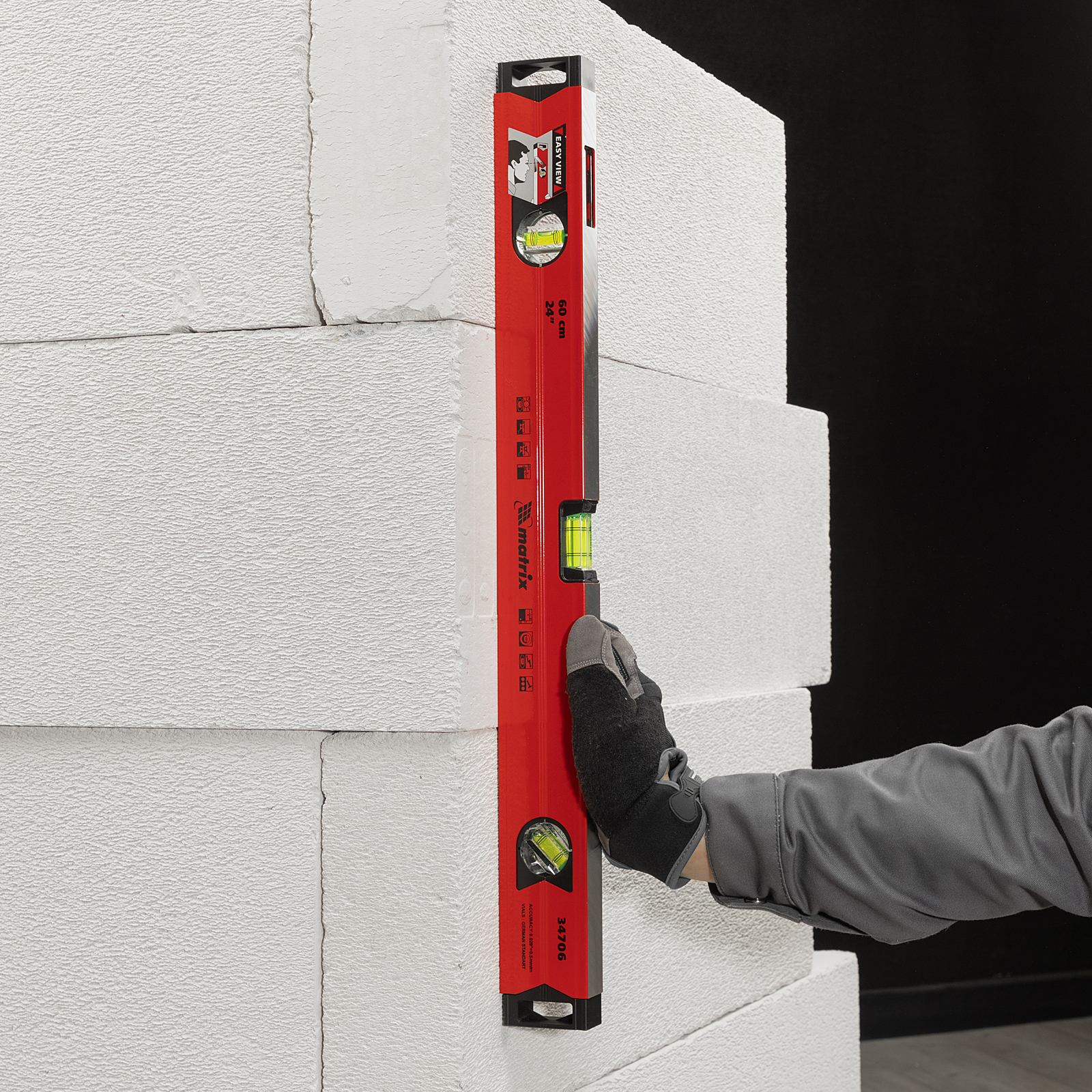 Алюминиевый магнитный уровень Matrix 34706 длиной 600 мм, усиленный, оснащен 3 глазками и одним зеркальным отражателем. С его помощью можно выявить отклонения от вертикали, горизонтали и угла 45 градусов. Встроенный зеркальный глазок повышает удобство работы, позволяя легко считывать показания.,Для определения отклонения вертикали 90 градусов необходимо использовать пузырьковую ампулу только в верхнем положении уровня. Только базовая поверхность является рабочей (противоположная ампуле 180 градусов).