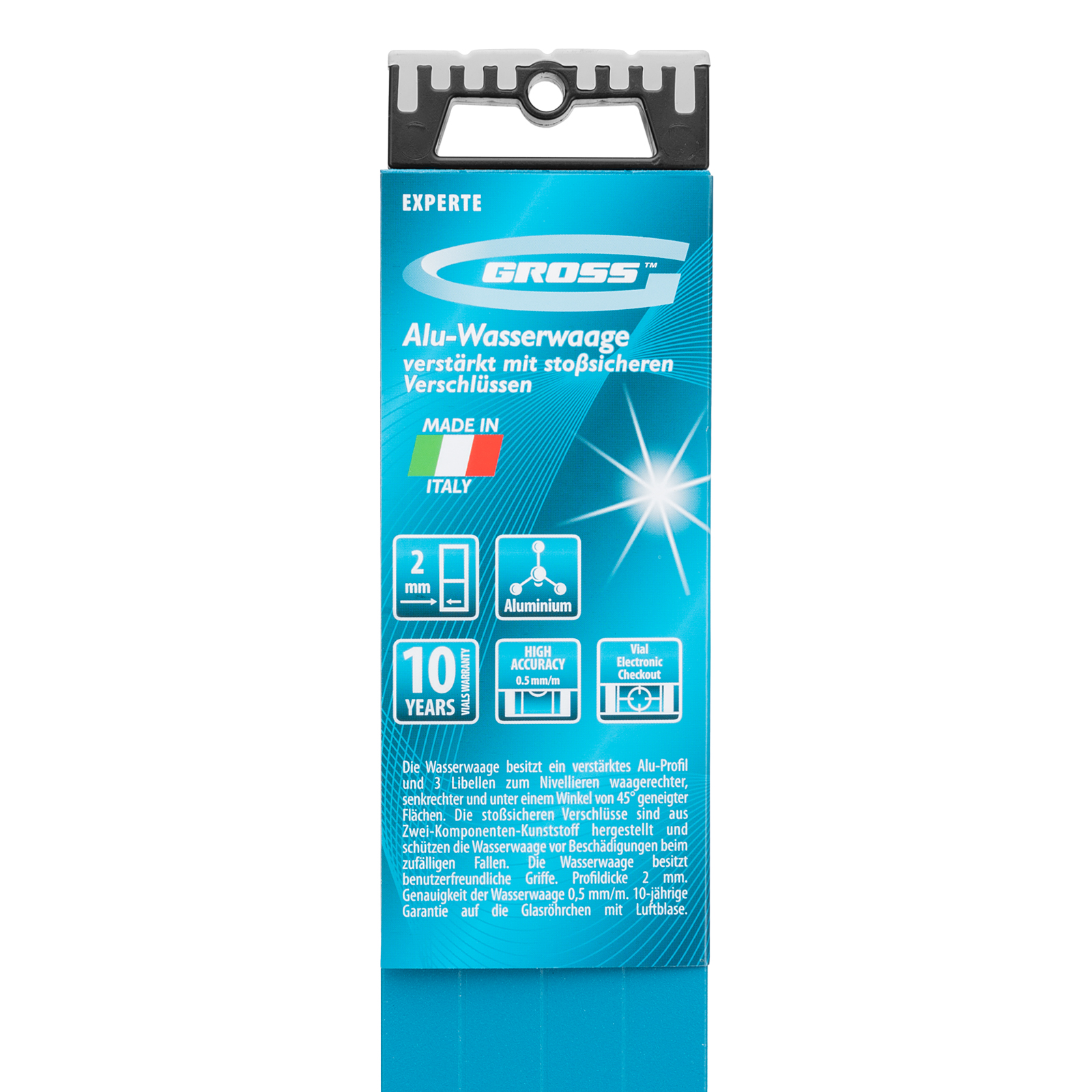 Усиленный алюминиевый уровень Gross 34340 длиной 2000 мм, с ударопрочными заглушками, рукоятками и 3 глазками, — универсальный инструмент для решения профессиональных задач на строительной площадке. Благодаря ему можно выровнять поверхности относительно горизонтали и вертикали или проверить соответствие углу 45 градусов.