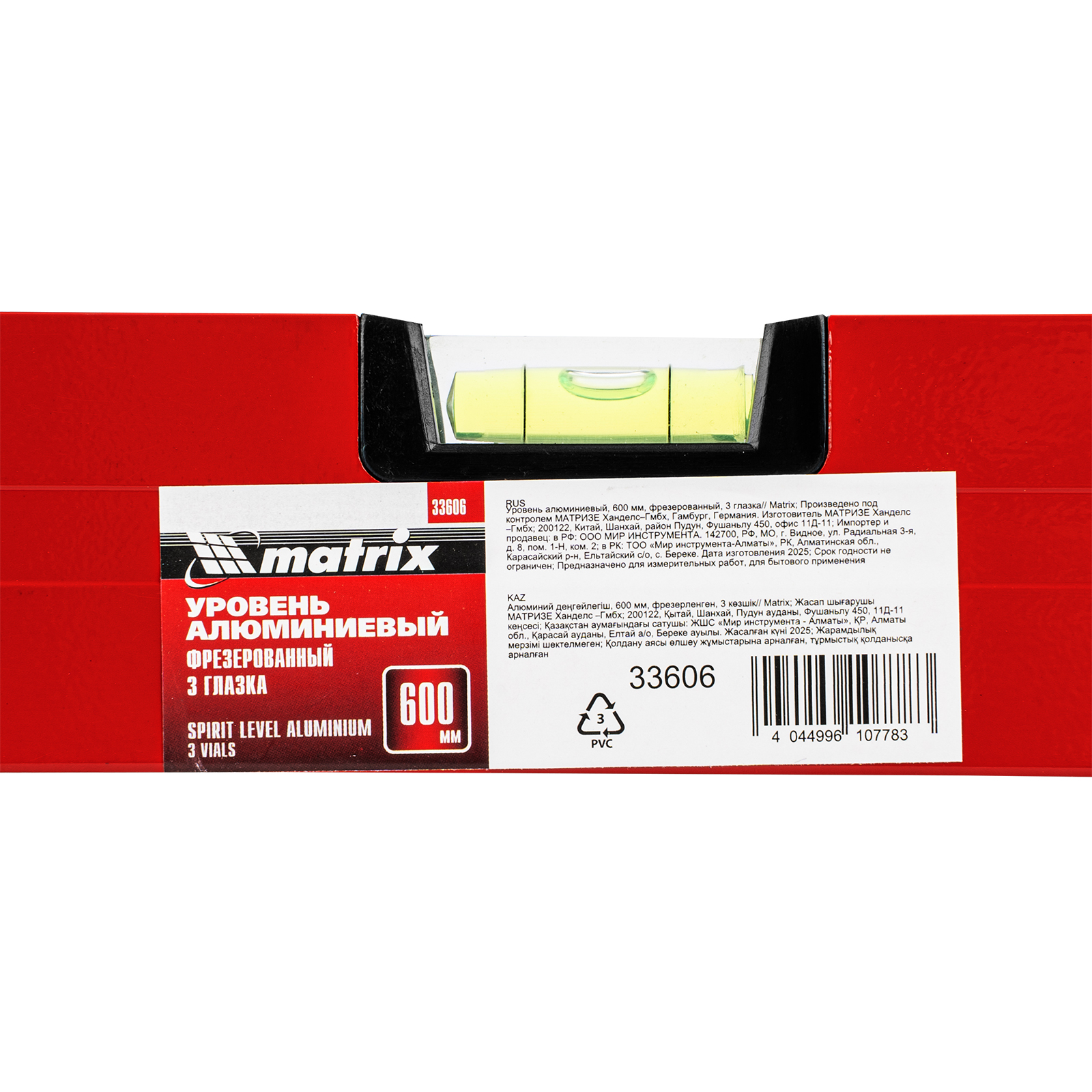 Фрезерованный алюминиевый уровень Matrix 33606 длиной 600 мм, с 3 глазками, пригодится мастерам во время строительства, ремонта и выполнения монтажных работ. Уровень с 3 глазками служит для проверки горизонтали и вертикали, а также угла 45 градусов.,Для определения отклонения вертикали 90 градусов необходимо использовать пузырьковую ампулу только в верхнем положении уровня. Только базовая поверхность является рабочей (противоположная ампуле 180 градусов).
